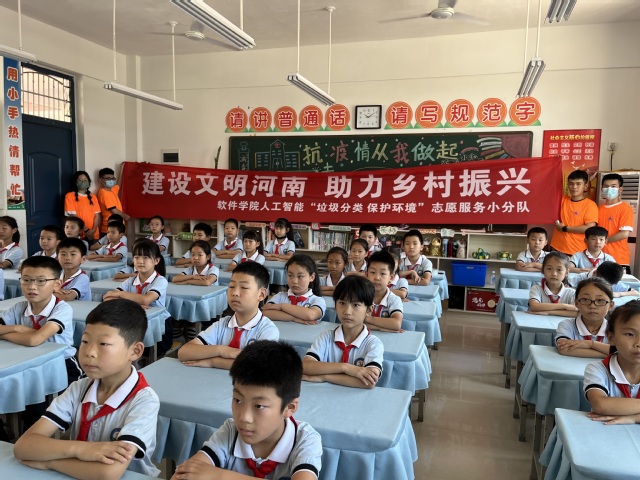软件学院人工智能“垃圾分类,保护环境“志愿服务小分队,“建设文明河南,助力乡村振兴”实践活动于驻马店市第三十八小学正式开始。小分队以宣讲形式入校,围绕垃圾减量与分类、资源循环利用、爱护生态环境等概念,结合日常生活,阐述了对垃圾分类的认识和理解,突出垃圾分类的益处和价值,呼吁孩子们积极践行垃圾分类,保护身边环境,倡导资源回收利用,为营造清洁、优美、舒适的宜居环境贡献出自己的一份力量。