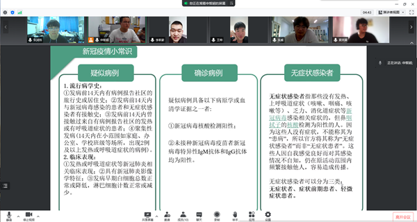 7月8日,实践队员从网络上搜索整理科学的疫情防范知识,讨论制作疫情宣讲ppt,在线上通过腾讯会议的形式,为村里和社区内的群众们,广泛宣传封控防控的科普知识,开展有特色、有温度、有意义的封控防控志愿者活动,做家庭、长辈间的防控知识宣传员,帮助村里和社区的老人们建立良好的自我防范意识,做到人人皆是防疫宣讲员。