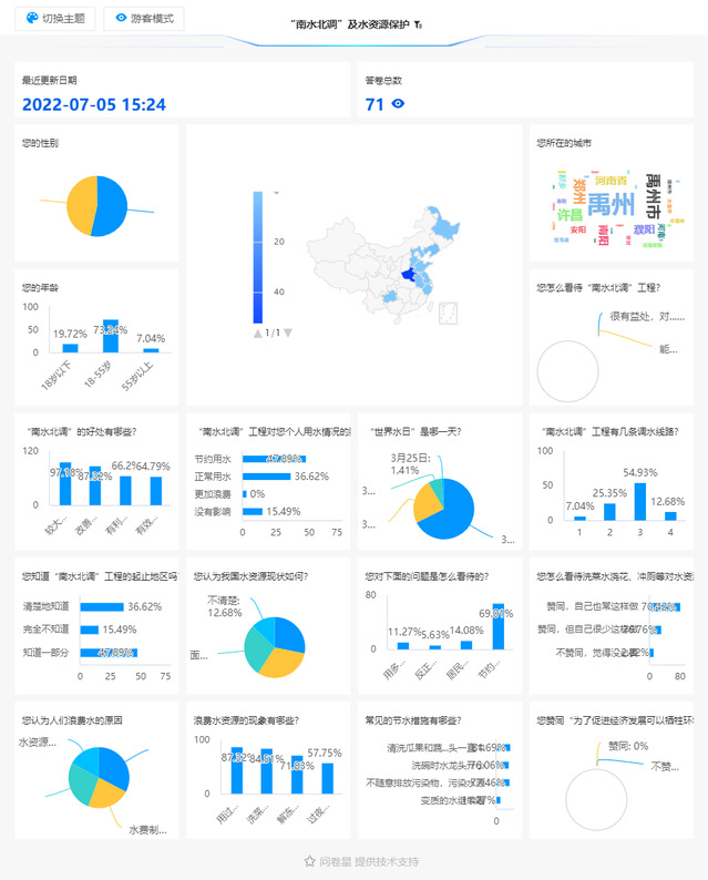为进一步了解大众对“南水北调”工程以及水资源保护相关问题的认识,7月6日实践队员们以线上线下相结合的方式发放了调查问卷和宣传页,调研对象覆盖各个年龄层,各项职业等,有效提高了调研结果的说服力。调查显示,大多数人对相关问题有所了解,但了解不深,尚停留在一知半解,认识片面的阶段,比如在问到“国家水资源现状”时,得到的回答普遍是勉强够用,但没有认识到地域水资源量的差异。日常生活中节水护水的意识也有所欠缺,自觉行动相对较少,比如,问到“怎么看待一水多用的行为,自己平时是否有类似的习惯”时,得到相对统一的赞同意见,但自己却不常这样做的答案。基于此类情况,实践队员也在当下就为受访对象普及了相关知识,让大众对全国水资源现状有正确客观的认识,并且针对日常生活中的实际情况提出了切实可行的建议,有效地促进了大众对水资源的积极保护及合理利用。