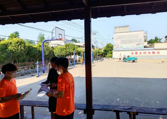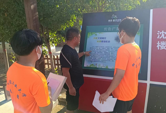 乡村振兴,治理有效是基础。实践团队员们跟随村干部的步伐,来到村口的数字沈楼参观示意图旁。村干部通过示意图为队员们讲解村内治理规划:在路口布设垃圾桶,设置统一垃圾处理站点,有效改善村内生态环境与居住环境;修建桥梁,保障村民生命财产安全等。随后队员们跟随村干部来到村民的主要娱乐场所--文化广场,这里为村民们提供了篮球场、乒乓球台等运动场地,墙上还挂有大型屏幕定期播放电影,美丽乡村于细微处着眼,为丰富村民的生活助力。