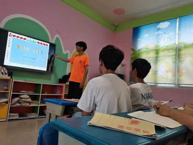 7月2日,实践队员在河南省南阳市浙川县荆紫关镇开展“以史为鉴,以史育人”党史宣讲教育活动。实践队员以“小兵张嘎”、“小萝卜头”、“小交通员潘东子”三位小英雄的典型事迹为引子,向儿童讲述党史故事。不同于生硬的道理与乏味的讲解,宣讲期间队员与儿童频繁互动,激发孩子们的积极性。