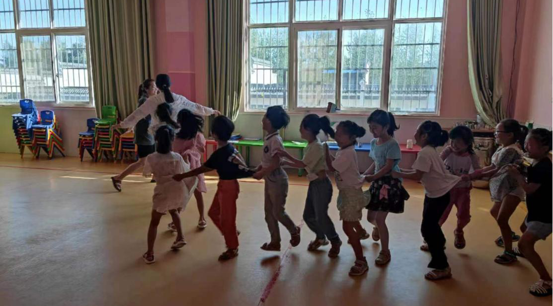 7月15日上午,实践队又来到南阳市淅川县寺湾镇康德幼儿园。在这里,实践队员们首先通过和留守儿童们一起做老鹰捉小鸡、击鼓传花等小游戏迅速地走进小朋友的世界。教室里笑声不断,小朋友们的脸上洋溢着欢乐的笑容。紧接着,实践队员和孩子深入交谈,了解孩子们的真正所需,聆听孩子们内心深处的渴望,队员们向留守儿童讲述了张桂梅坚持教育报国初心,扎根贫困地区40余年,让1600余名贫困山区女学生圆梦大学的正能量故事,告诉他们要努力学习,用知识改变命运,帮助他们树立正确的价值观。随后为小朋友们播放了影片《厉害了,我的国》,该片让他们深入了解了在过去的几年里我国取得的惊人的成绩,宏伟蓝图的描述也让他们更加振奋,从而激发他们的自信心和自豪感,坚定努力学习、报效祖国的梦想,厚植爱党爱国情怀。