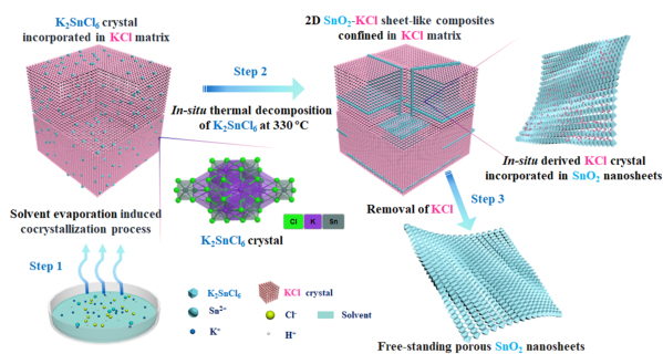 二维多孔金属氧化物纳米片(2DMONs)具有高的表面体积比、周期性的长程旋转和平移对称原子结构,在能源存储、催化、电子器件和化学传感器等领域的各种应用中引起了广泛的研究兴趣。然而,现有的2DMONs合成方法过程复杂苛刻,效率低,不利于实际应用,因此,开发一种通用、高效、经济的晶态2DMONs的合成方法具有重要意义。针对此问题,该团队开发出一种共结晶诱导空间自限域方法合成多孔金属氧化物纳米片,以盐颗粒(如KCl和KBr)为模板合成晶态多孔金属氧化物纳米片,包括SnO2,Fe2O3,NiO,Co3O4,CuO,ZnO,In2O3,CeO2和二元金属氧化物CeO2/SnO2,Co3O4/Fe2O3;并将其应用于气体传感器领域中。制备的晶态2D多孔CeO2/SnO2纳米片作为气体传感器对3-羟基-2-丁酮表现出了优越的传感性能(3-羟基-2-丁酮是检测单核细胞增生李斯特菌的生物标志物)。