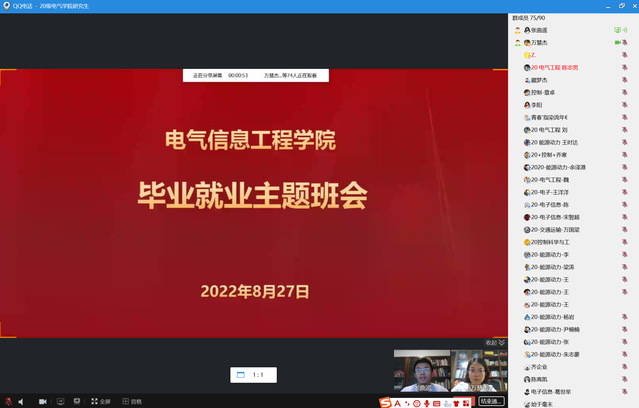 为做好新学期研究生返校学习与毕业就业工作,电气信息工程学院于8月27日分年级召开了研究生新学期线上主题班会。学院党委副书记万慧杰、研究生辅导员张曲遥老师以及学院全体研究生参与了班会。