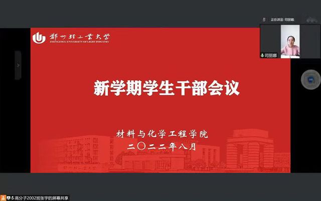 为加强学生干部队伍建设,切实做好新学期学生工作,8月31日中午,材料与化学工程学院通过线上召开新学期学生干部会议,学院党委副书记司丽娜、团委副书记赵梦婕、全体专兼职辅导员及主要学生干部参加本次会议。