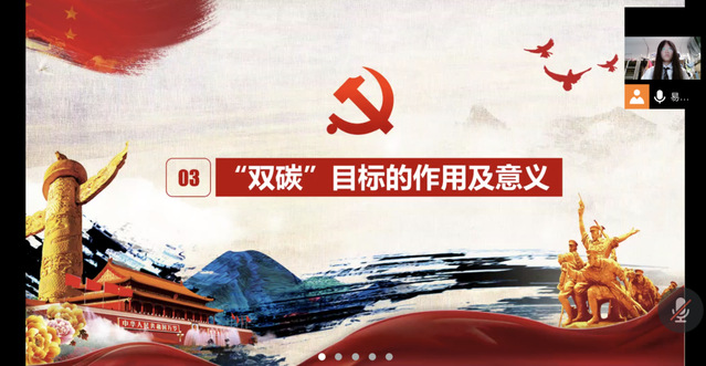 会上,易美君同学通过提问“何为双碳”作为开始,通过理论讲解到尊重自然、顺应自然、保护自然,是人类必须遵循的客观规律。通过易美君的宣讲,同学们纷纷意识到实现“双碳”目标是一项复杂的系统工程,实现“双碳”目标不是别人让我们做,而是我们自己必须要做。在这一点上,易美君同学积极动员大家努力将“双碳”目标与日常生活联系,与每一个人联系起来。另外,易美君提出青年学生应当清醒认识到“双碳”工作是一项涉及面广、影响深远的重大任务,是一件必须要做、而且必须做好的事情。实现“双碳”目标是场硬仗,需要新一代青年付出极大的努力,要进一步把思想和行动统一到党中央关于“双碳”的决策部署上来,坚定实现“双碳”目标的信心和决心。