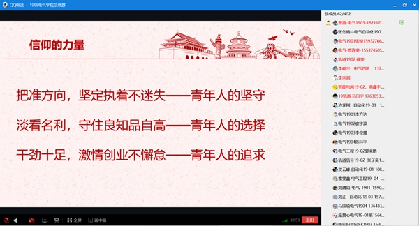 本次宣讲以“信仰的力量”为题,通过线上形式进行。会上,孔老师从什么是信仰、为什么要有信仰、青年人为什么要坚定马克思主义信仰、如何坚定马克思主义信仰四个方面进行宣讲,回顾中国近现历史,带领同学们了解马克思主义为什么行,中国特色社会主义为什么好、告诉同学们“把准方向,坚定执着不迷失”当是每一个青年人的坚守。心中有信仰,行事才有方向。如果没有信仰,人生观、世界观和价值观就会出现偏差。一个人如果没有信仰,就如同没有精神脊梁;一个国家或民族如果没有信仰,是不会走向复兴和繁荣之路。
