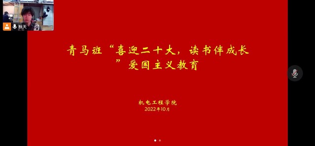 为深入学习领会习近平总书记关于青年工作的重要思想,以奋发向上的精神风貌迎接党的二十大胜利召开,10月7日,机电工程学院青马班举办“喜迎二十大,读书伴成长”线上读书分享会。