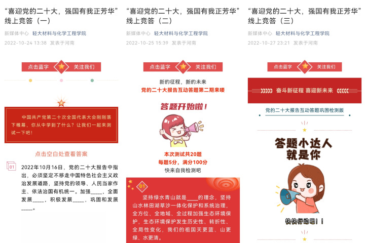 为深入学习贯彻党的二十大精神,团结引领青年学子听党话、跟党走,材料与化学工程学院于10月24日至10月30日举办“喜迎党的二十大,强国有我正芳华”线上竞答活动。
