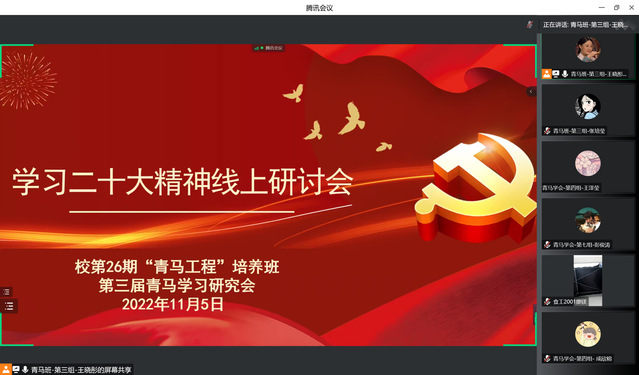 为使同学们深入学习党的二十大精神,深刻理解党的二十大精神内涵,11月5日,我校第二十六期青马班、第三届青马学会举办了学习党的二十大精神线上研讨会,会议由青马班团支书王晓彤主持,青马指导老师、第二十六期校青马班全体学员、第三届青马学会会员代表参加了本次活动。