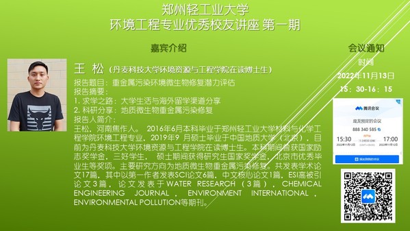 11月13日下午,材料与化学工程学院环境工程专业邀请2016届本科毕业生、丹麦科技大学环境资源与工程学院在读博士王松以线上会议的方式为学生作了题为“重金属污染环境微生物修复潜力评估”的学术报告,详细介绍了大学生活与海外留学经验,并就近年来的科研成果与学生进行了分享。在考研和考博方面,王松博士分析了近五年全国考研形势,建议同学们应早做决定、提前准备、合理安排时间。在海外读研和读博方面,介绍了出国留学的程序、渠道以及注意事项,他建议同学们应提前了解政策、重视学习成绩、提高英语水平,以及高质量的科研成果。随后,针对近年来的科研进展与参会同学进行了分享。