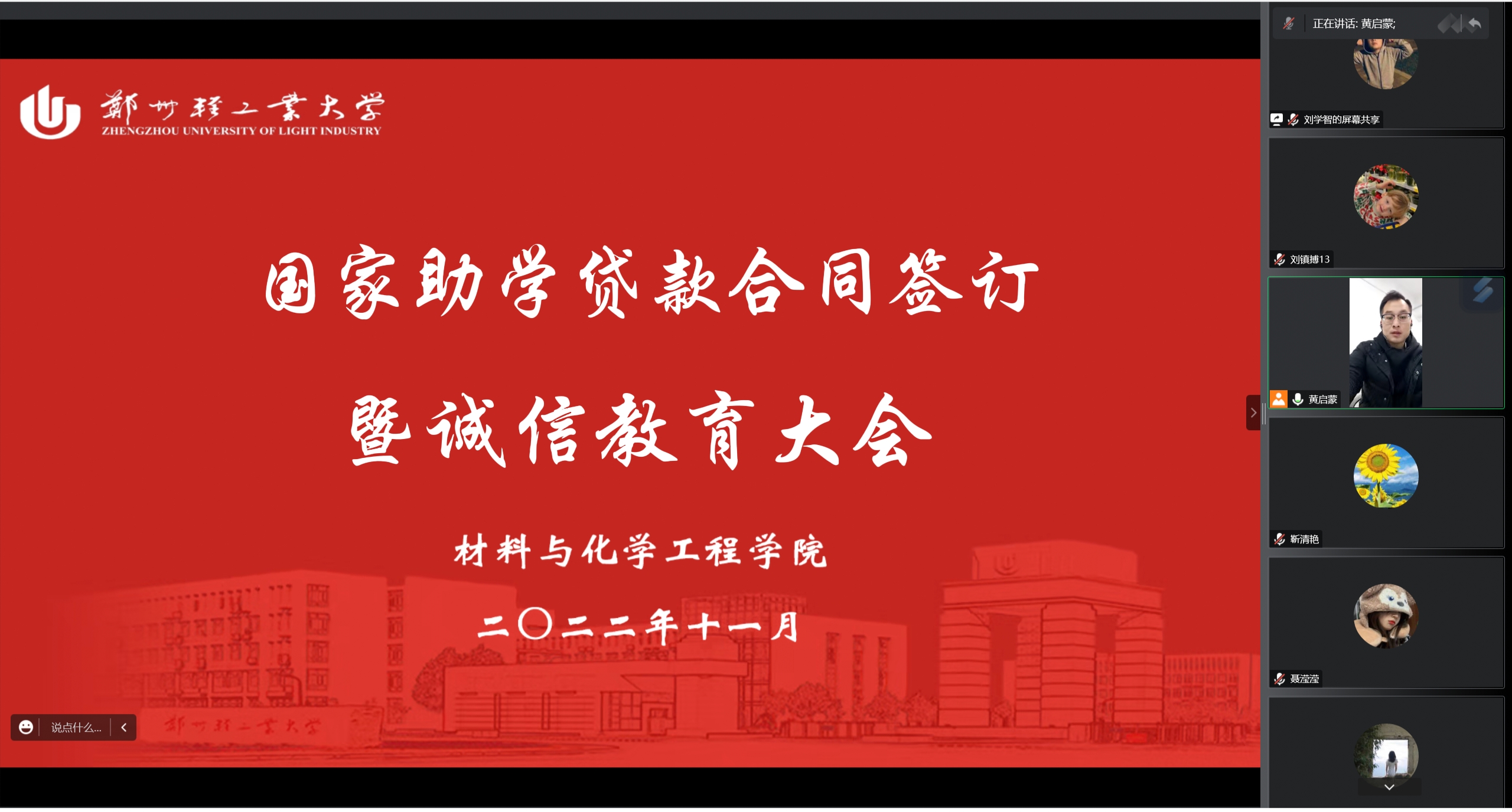 为扎实做好学院助学贷款工作,完善助学贷款各项工作流程,进一步强化我院助学贷款学生诚信教育。11月12日,材料与化学工程学院线上召开了2022年高校助学贷款合同签订仪式暨诚信教育大会。负责学生资助工作的黄启蒙老师、助学贷款学生参加了此次会议。