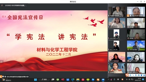 为认真学习宣传党的二十大精神,深入学习贯彻习近平法治思想,进一步在广大师生中普及宪法知识、弘扬宪法精神,引导师生自觉成为宪法的忠实崇尚者、自觉遵守者、坚定捍卫者,12月6日,材料与化学工程学院组织开展“学宪法 讲宪法”主题教育。