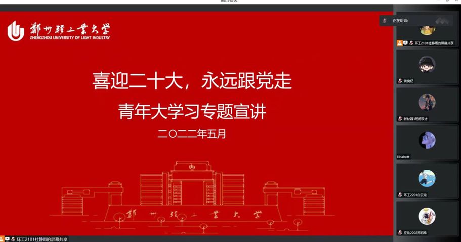 为深入贯彻落实习近平总书记关于青年工作的重要思想,迎接党的二十大,庆祝中国共产主义青年团成立100周年。材料与化学工程学院于五月四日线上开展了“喜迎二十大永远跟党走”青年大学习宣讲,帮助同学们深入学习贯彻习近平新时代中国特色社会主义思想,弘扬和传承五四精神。