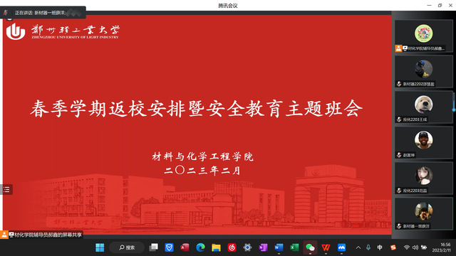 为提高学安全意识和防护能力,确保学生安全有序返校,2月6-8日,材料与化学工程学院线上开展学生返校安全教育主题班会。学院全体学生参加。