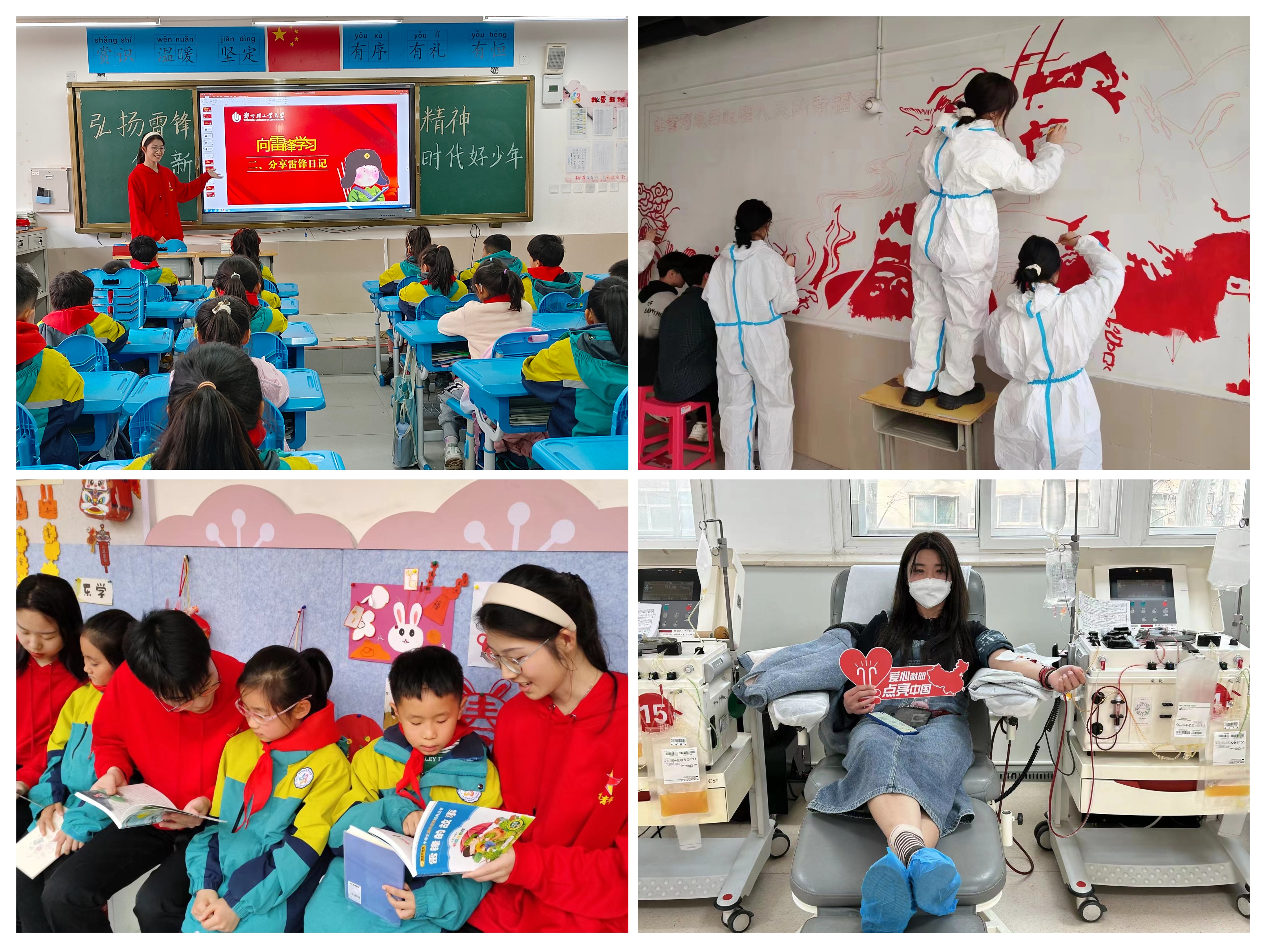 艺术设计学院、“青马领航”志愿服务队走进科学大道第二小学开展手工墙绘、知识竞答、趣味游戏等志愿服务活动;政法学院学子前往河南省血液中心开展“雷锋精神永存,点滴热血助人”单采成分血义务献血志愿服务活动,增强了学雷锋活动的吸引力、感召力,营造了学雷锋、做先锋的良好氛围。