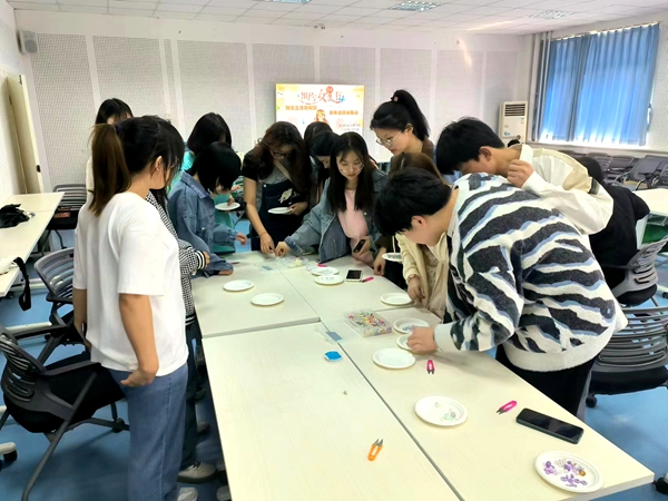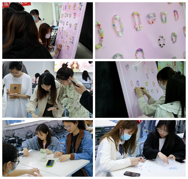 志愿者们预先准备了五颜六色的串珠,并为到场的同学们讲解了串珠制作方法、技巧和颜色搭配,手把手地进行传授。活动中,每一名参与者都全神贯注地做着面前的手串,在轻松愉悦的氛围下,大家渐渐敞开心扉,开始兴致盎然地讨论起来。看着一颗颗小珠子经过自己的双手变成精美的工艺品,同学们收获了满满的成就感和幸福感。一颗颗珠子在同学们的手中变得活灵活现。现场气氛高涨,教室里充满着同学们的欢声笑语。每一串手链的色彩,造型都由同学们的精心搭配而来,亲手制作的手链也被赋予了特殊的意义。在短暂欢乐的时光后,同学们将自己制作好的手链挂在展板上合影留念,记录下这温馨美好的时刻。