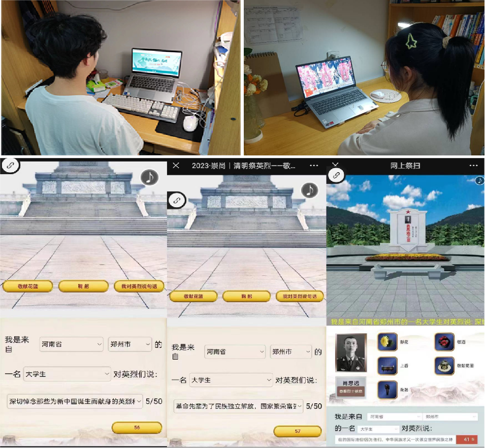 机电工程学院、政法学院、数学与信息科学学院学生通过线上学习革命先烈的英雄事迹、观看系列视频等方式追思先烈,致敬英雄;通过“中国文明网”“中华英烈网”“河南文明网”等网上平台,开展网上献花、留言寄语等云上追思活动,寄托对英雄烈士的无限哀思和无比崇敬,表达对英烈的敬仰缅怀之情。