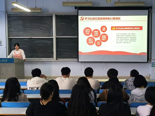 团日活动中,有的团支部开展弘扬红旗渠精神主题团课,团支书围绕红旗渠的修建背景和过程,红旗渠精神的时代内涵、现实意义和时代价值等方面展开讲解,还通过网络带领同学们一览红旗渠的壮美风光,让同学们了解潜藏在这片山水背后的故事,引导同学们在学习思考中深化认识;有的团支部举办红旗渠相关文字作品诵读活动,同学们满怀深情地进行朗诵,字正腔圆、声情并茂,他们用自己的声音向同学们传递了对祖国大地的热爱,对革命先辈的敬仰,对先进人物的赞美以及对新时代中国特色社会主义发展的期待;有的团支部通过播放《红旗渠》纪录片,带大家共同回顾那段开凿“人工天河”的艰难岁月以及前辈们玉汝于成的奋斗历程,激励团员青年们团结一心,接续奋斗。此外,部分团员代表在老师的代领下前往红旗渠纪念馆、青年洞等地实地参观学习,亲眼目睹红旗渠工程的伟大壮观,更加直观地了解林县人民修建红旗渠时遇到的困难和挑战,深切感受到林县人民不认命、不服输、敢于战天斗地的英雄气概。交流讨论环节,同学们围绕习近平总书记视察红旗渠时的讲话精神和青年学生责任担当进行讨论,大家纷纷表示要继承和发扬“自力更生、艰苦创业、团结协作、无私奉献”的红旗渠精神,勇于面对学习生活中的挫折和考验,难而不惧,奋斗不息,把青春热血镌刻在历史的丰碑上,让红旗渠精神永葆青春和活力。