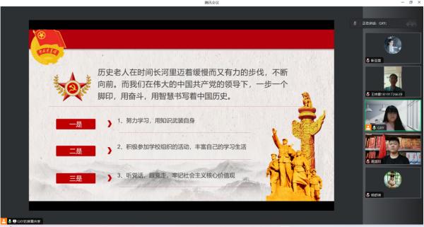 考虑到暑期炎热、课业繁重,宣讲队成员利用中学生们的课余时间,依托网络平台,在线上组织了简短的团课理论交流会。围绕“青春心向党,奋进新征程”,队员们采取理论知识宣讲与视频结合的方式,畅所欲言地分享青年学生对建功新时代的想法及计划。大家纷纷表示,新时代团员青年理应坚定不移跟党走,牢记党的教诲,立志民族复兴,立志做有理想、敢担当、能吃苦、肯奋斗的新时代好青年,在青春的赛道上跑出当代青年的好成绩,让青春在全面建设社会主义现代化国家的火热实践中绽放绚丽之花。