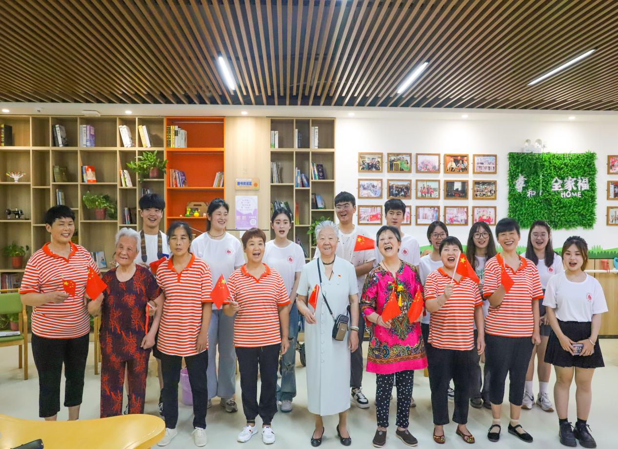 7月1日,志愿服务队来到本次活动的第一站——孝和老年公寓小岗刘店。老年公寓负责人向大家讲述了老年公寓的成立初衷、发展历程以及目前在此生活的老人们的性格特点等基本情况,并强调了活动中的注意事项。随后,队员们来到了活动室和老人们见面。当天正值建党节,队员们在自我介绍后,便带领老人们唱起了红色歌曲,共同庆祝党的102岁生日。在队员们的深情演唱中,老人的情绪也被调动了起来,他们情绪高涨、满怀激动,和队员们一起合唱了《没有共产党就没有新中国》《东方红》等耳熟能详的经典曲目,激昂的旋律仿佛让人回到了那个波澜壮阔的时代,每个音符仿佛都承载着他们对党的无限赞美与感激。