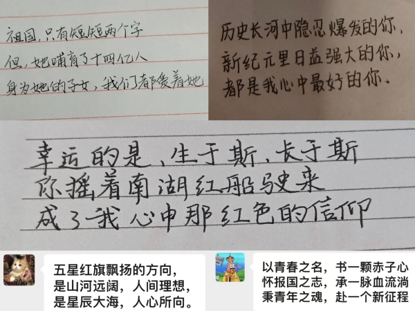 三行情诗告白祖国山河。学院组织学生们以“三行情书”的形式展现对祖国母亲千言万语道不尽的爱。各团支书分别通过线上与线下的不同形式带领各班同学向祖国告白,以文字歌颂祖国大好河山,抒发赤诚爱国情意。