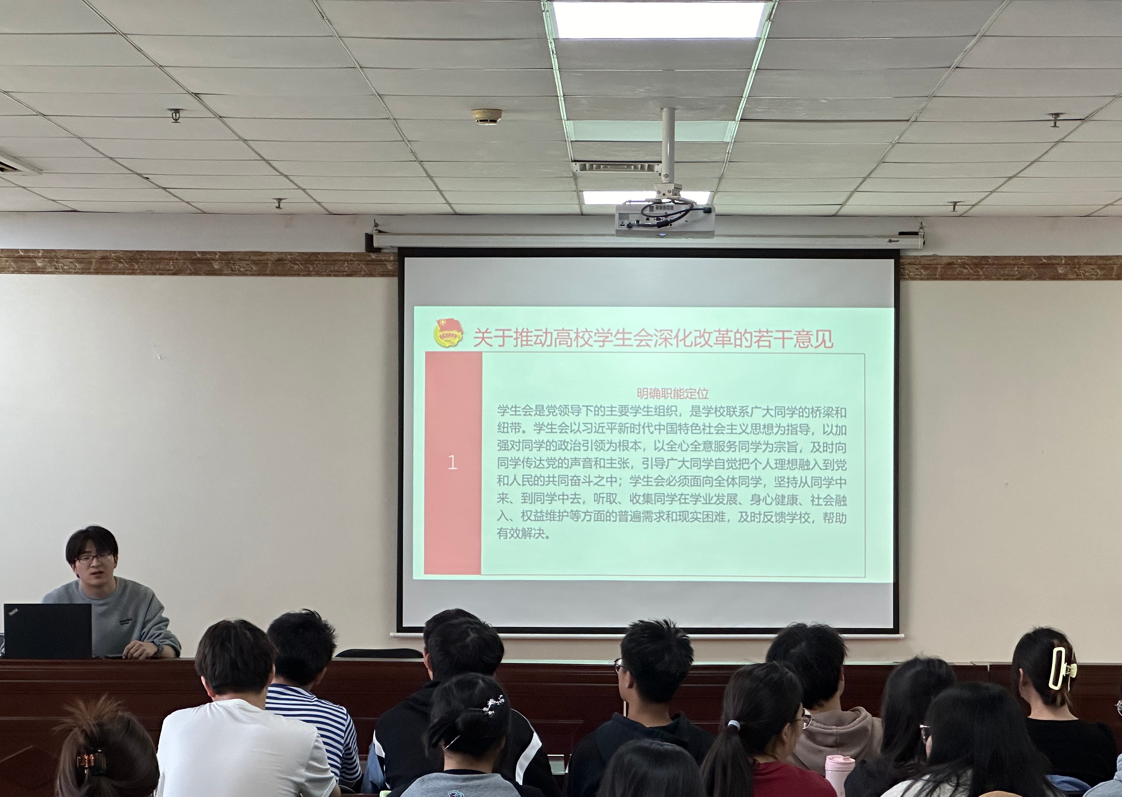 会上,周老师以“深入学习贯彻习近平文化思想”为题,详细解读了“七个着力”的重大要求,强调要深刻理解习近平文化思想的核心要义、丰富内涵和实践要求,科学把握其鲜明的理论品格,持续加强学习研究。随后,学生会主席团成员孔佳宁领学了《关于推动高校学生会(研究生会)深化改革的若干意见》《关于学联学生会工作人员改进作风服务同学的若干规定》等文件精神。周老师强调了学生会深化改革、学生组织作风建设的重要意义,指出学生会成员一是要坚持正确的政治方向,以加强对同学们的思想政治引领为根本,及时向同学们传达党的声音和主张,引导广大同学自觉把个人理想融入党和人民的共同奋斗之中;二是要牢记全心全意服务同学的宗旨,学生会作为联系广大师生的桥梁和纽带,应该植根同学、依靠同学、代表同学,从同学中来,到同学中去,帮助同学有效的解决问题。