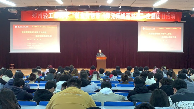 “就业传帮带·师兄师姐面对面”主题示范团日活动。本次团日活动邀请了经济与管理学院优秀校友——现任河南省叶县保安镇杨令庄村支部助理的赵繁森担任主讲嘉宾,各学院学生代表500余人参加了本次主题团日活动。