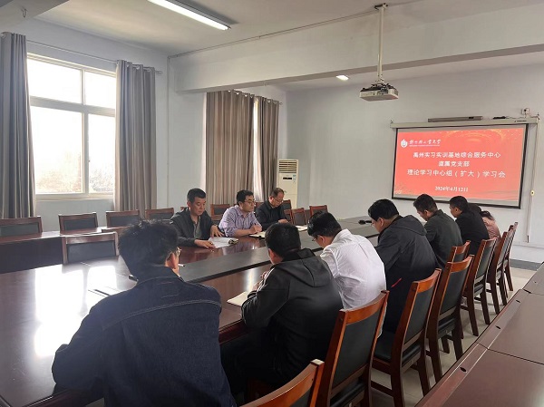 4月12号上午,禹州实习实训基地综合服务中心直属党支部在2号楼204会议室召开理论学习中心组(扩大)学习会。部门班子成员和科室负责人参加会议,会议由直属党支部书记王斌主持。