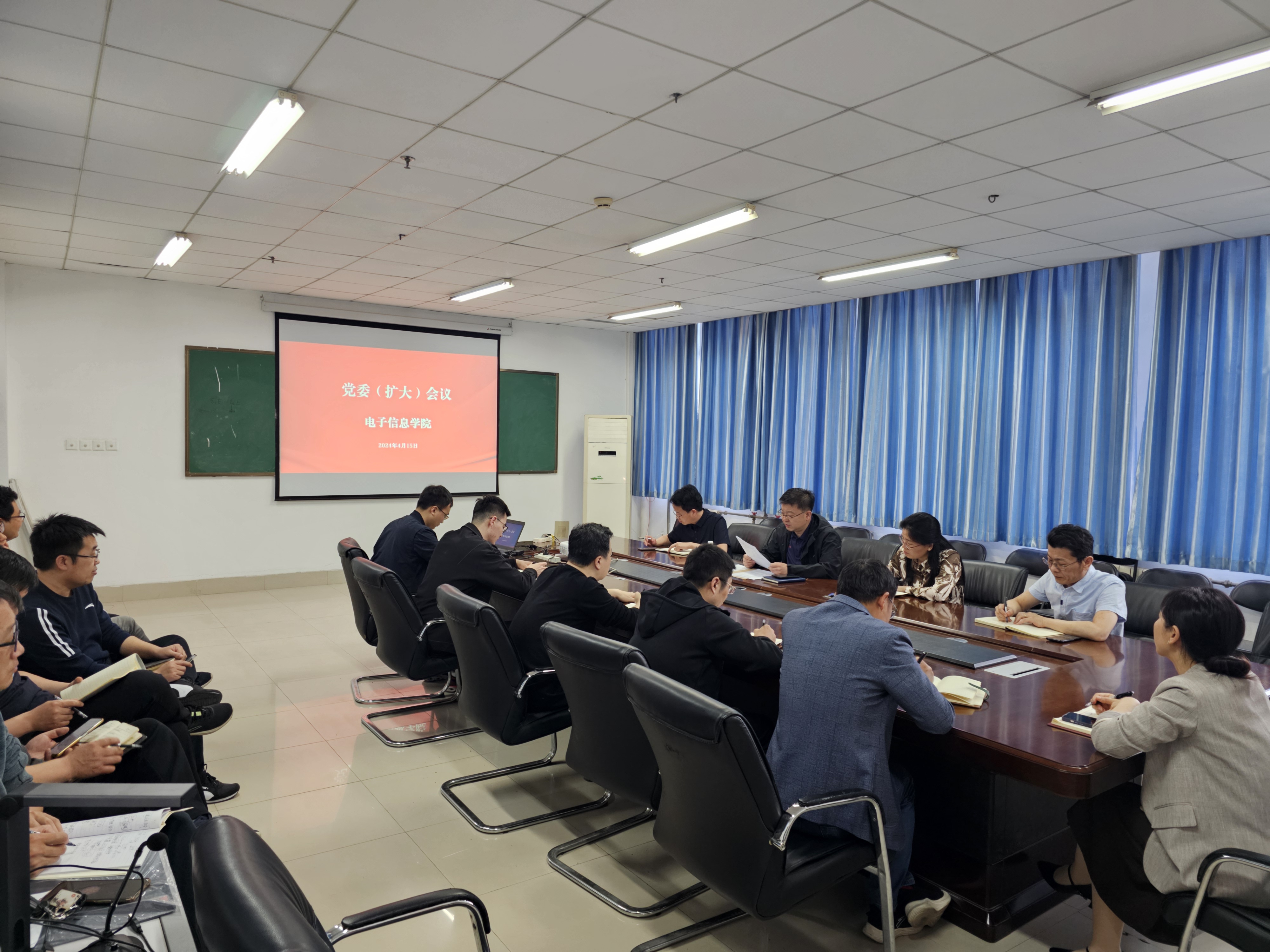 4月15日下午,电子信息学院在四教楼510召开党委扩大会议,安排部署党纪学习教育工作。学院领导班子成员、全体科级干部参加会议,会议由学院党委书记赵阳主持。