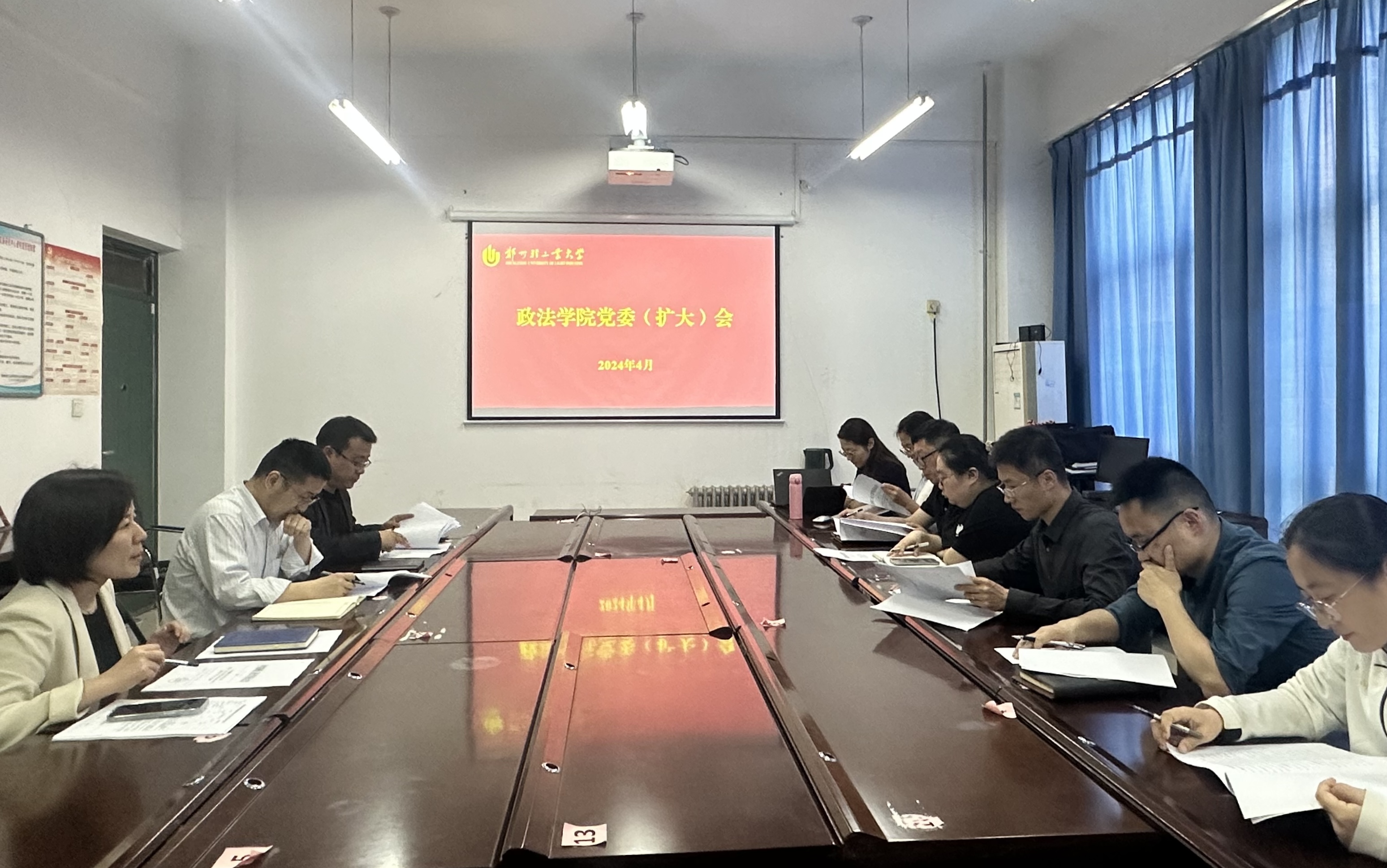 4月15日,政法学院在政法楼308会议室召开党委(扩大)会议,研究部署党纪学习教育工作。学院领导班子成员、各党支部书记参加会议。会议由学院党委副书记孔朋主持。