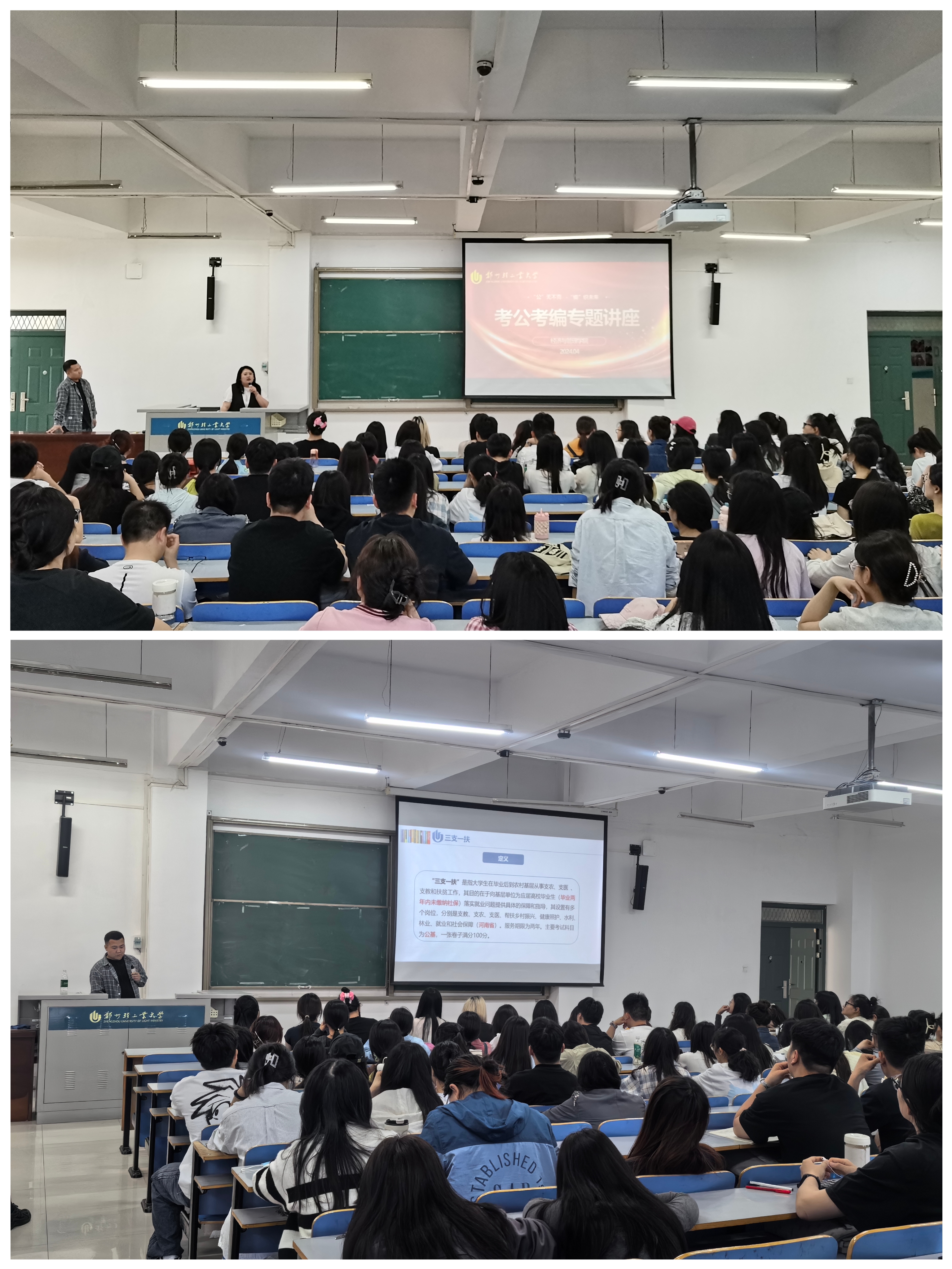 为了促进我院学生做好职业发展规划,了解考公考编的相关流程和知识,提升同学们对相关考试的认知程度和应考能力。4月18日下午,经济与管理学院在经管楼309教室举办了轻青小课堂——考公考编专题讲座。本次讲座邀请焦作市某区直单位公务员、我院校友赵继伟作为主讲人为同学们分享考试经验,介绍考公考编知识及政策。学院2024届及2025届近200名学生参加了此次讲座。