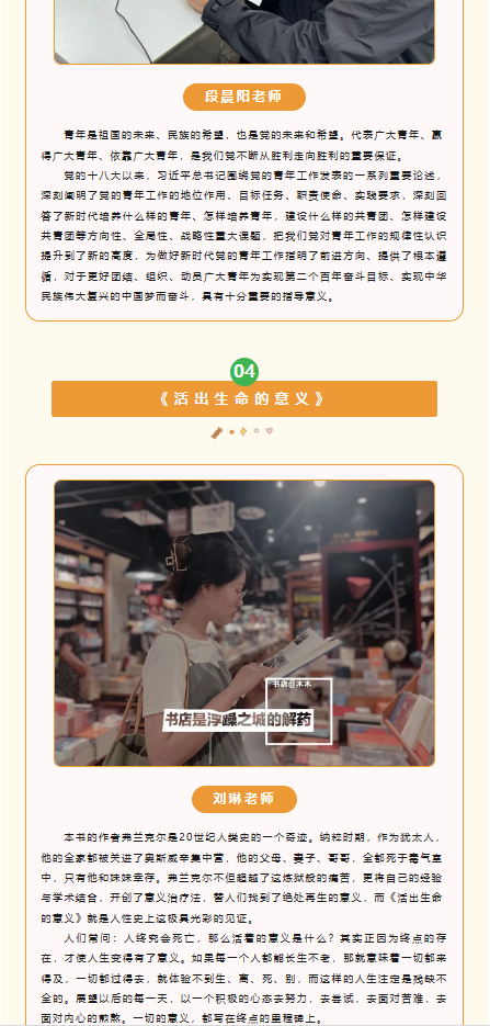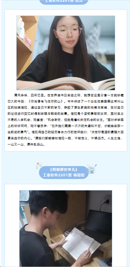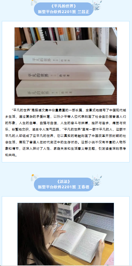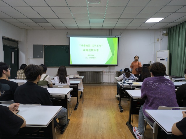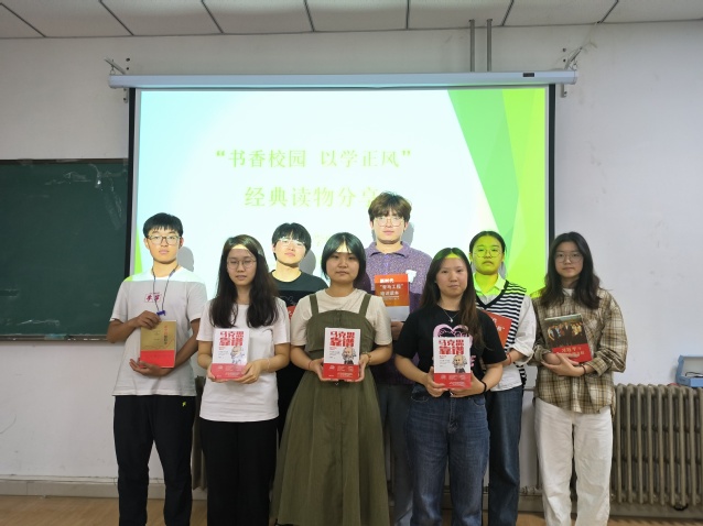 此次活动采取了线上线下相结合的方式,线上对大家所喜欢的经典读物片段及阅读心得进行收集,并以推文形式进行展示。首先邀请了辅导员老师于线上与大家推荐经典读物及理由,其中学工办副主任刘琳分享了读物《活出生命的意义》,希望同学们认真读书,能够以积极的心态去努力,去尝试,去面对苦难,去面对内心的煎熬。线下读书会上学生代表依次上台向大家诵读自己喜爱的读物中经典片段,结合个人学习生活实际,分享了自己所选书籍的学习心得和独特感悟,其中张江涛同学分享了红色经典书籍《红岩》讲述了共产党员面对敌人不屈不挠的坚强意志;闫学爽同学分享了《习近平新时代中国特色社会主义思想学习纲要》,阐述了对新时代爱国主义的理解以及对未来发展的思考和努力方向。最后刘慧老师对部分资助帮扶群体进行赠书,鼓励他们多读书,读好书,通过读书拓宽视野,坚定信念。