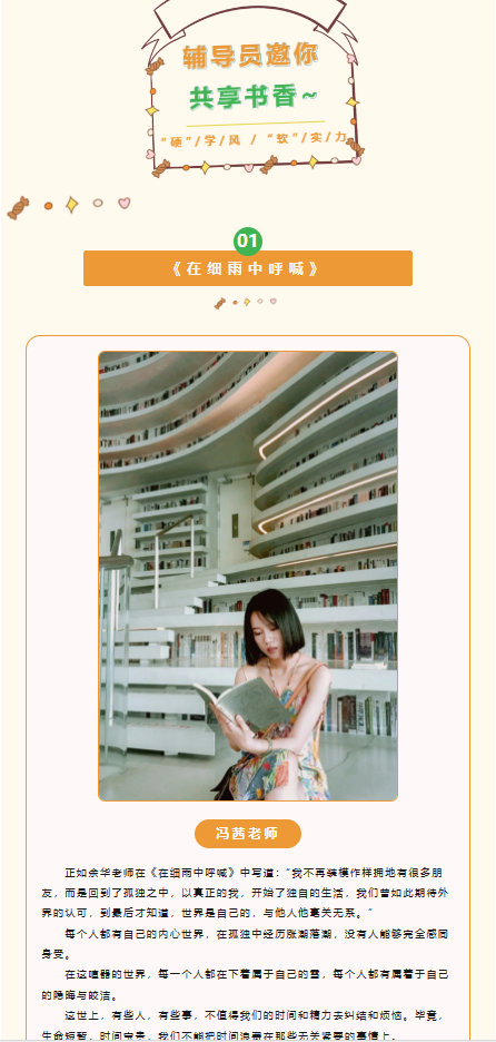 本次读书分享活动提升了大学生的人文素养,进一步推动了我院““硬”学风“软”实力”学风建设系列活动的顺利开展,为促进我院优良学风建设,营造崇尚学习、积极向上的校园文化氛围奠定坚实基础。