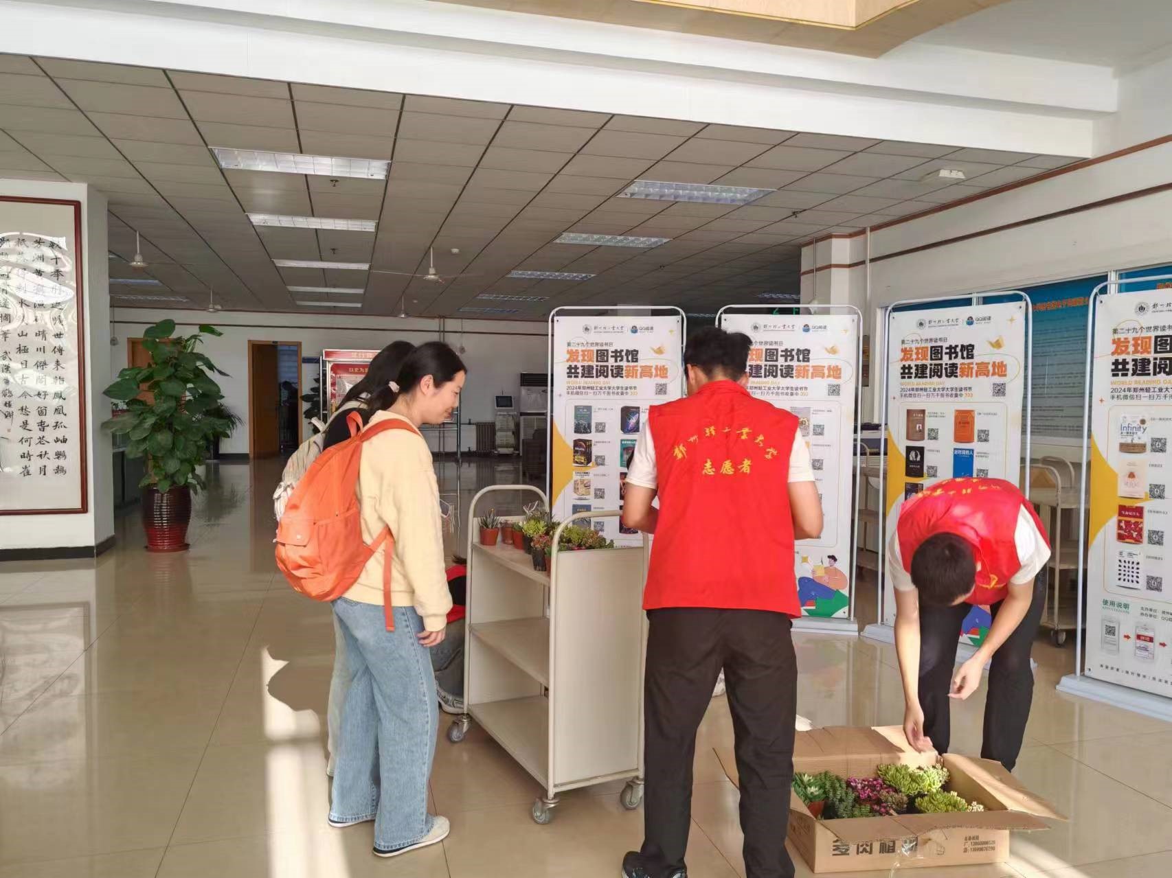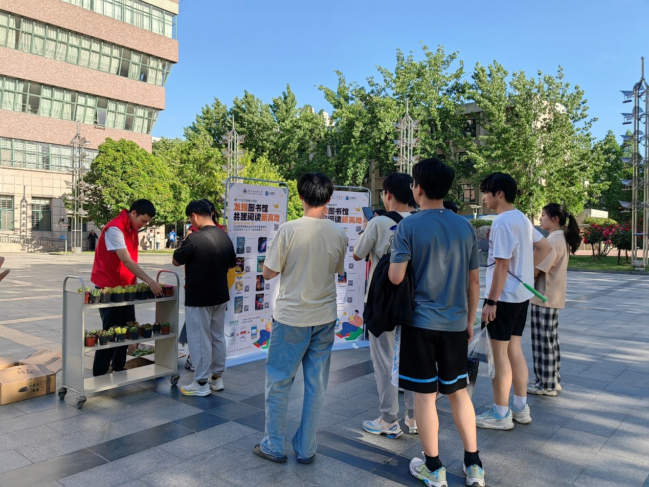 在东风校区图书馆二楼大厅及图书馆前广场,读者通过扫码阅读电子书,即可现场免费领取一盆清新可爱的多肉植物。在“世界读书日”,既可以读书,还能收获一枚“小可爱”,现场读者的脸上都洋溢着幸福的气息。
