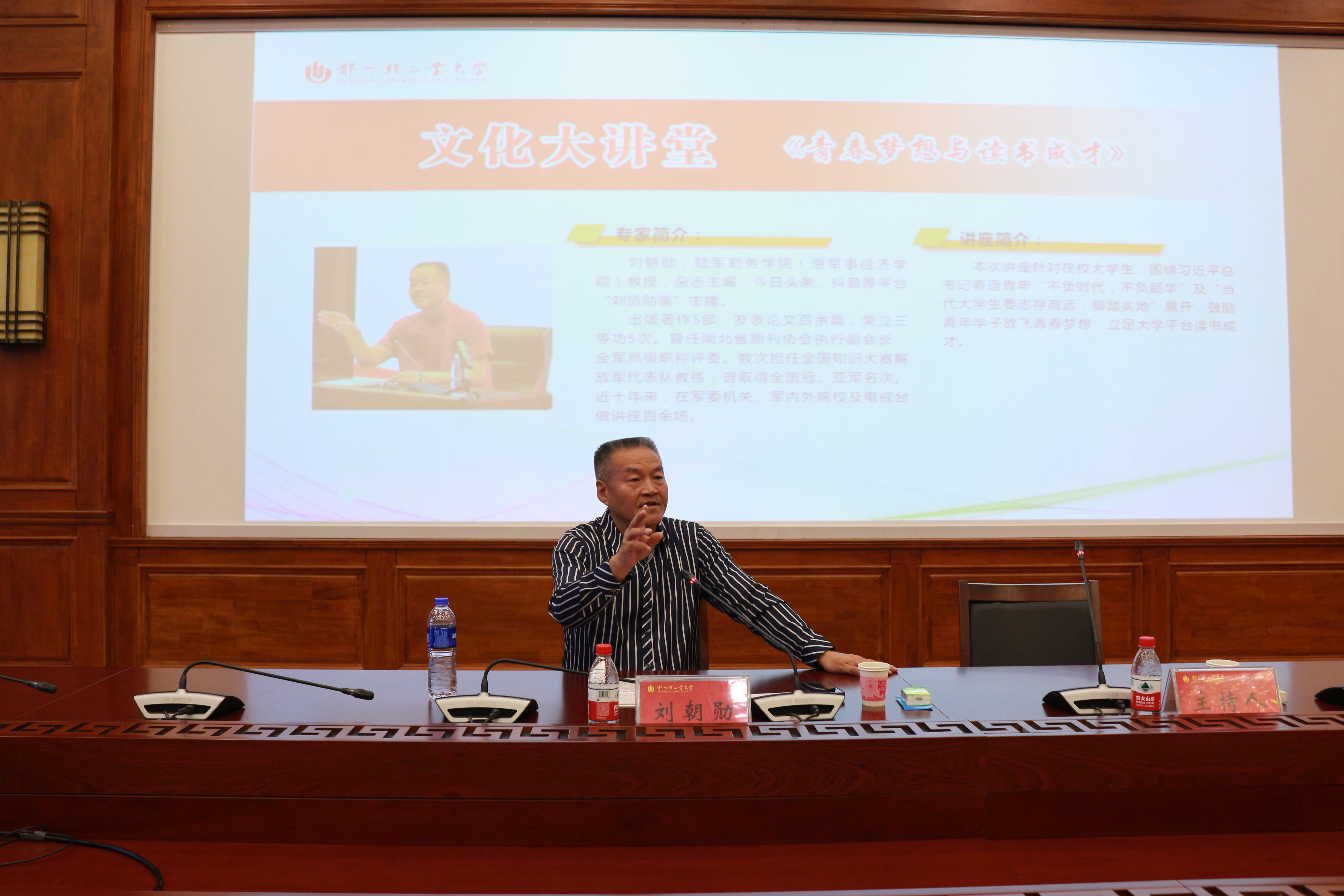 刘朝勋教授结合自身30多年军校学习、执教及工作经历,启发大家珍惜大学时光,多读好书,端正三观,修身修德筑梦追梦,将个人梦汇入“中国梦”的洪流。同时,讲座也生动讲述了大学生应该如何成为专才,如何拥有思辨能力,如何进行职业规划,如何提高抗挫能力,如何养成终身学习,终身读书的好习惯。在场青年学子专心致志,认真聆听,沉醉其中。