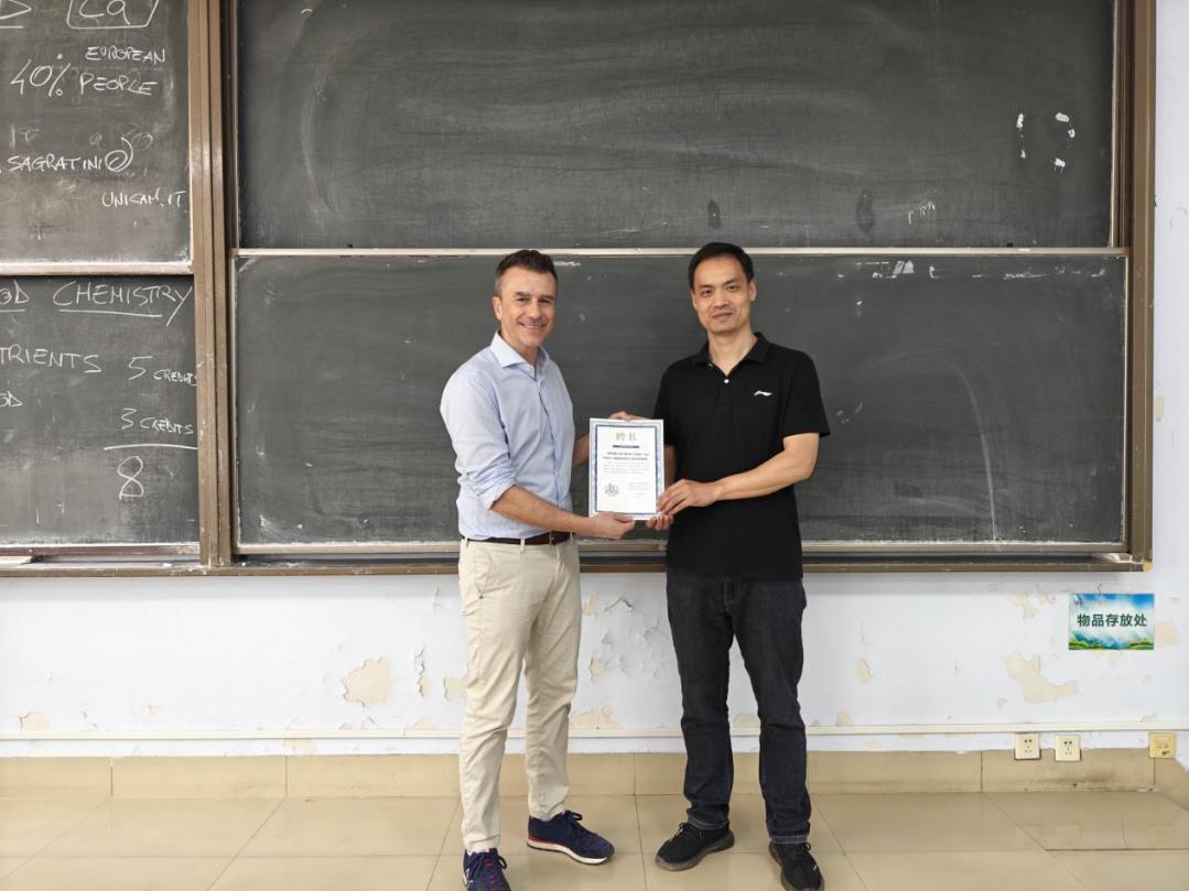 此次Gianni Sagratini教授来我校讲学,为我校师生提供了深入了解食品化学研究最新进展的机会,促进了两校间学术交流与合作,增进了学生对意大利卡梅里诺大学的了解,提高了学生对合作办学项目的认识。4月27日,在Gianni Sagratini教授讲学结束时,国际教育学院副院长贺宁代表学院为Gianni Sagratini教授颁发了客座教授聘书。