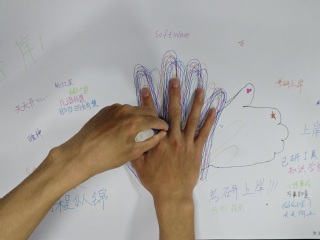 活动中,各班班长和心理委员为同学们讲解本次活动的目的、意义和规则。全班同学在一张A4纸上用不同颜色的彩笔签上自己的名字,也可以签上为自己或班级同学打气的标语,并将自己手掌形状用不同颜色描在纸上,班级同学的手掌层层叠加,互相击掌,在纸上“击掌为盟”并鼓励大家也可发挥创意,认真画出自己的掌印。现场同学们热情高涨,纷纷拿起画笔,在纸上精心描绘自己的掌印,或写下自己心情,或写下自己的小目标,以此激励自己不断努力。全部同学将多个掌印层层叠加在一起,传递着彼此的温暖和支持,也呈现着独属于每个班级的独特风采,希望未来的每个同学都能绽放出落笔时的最好模样。