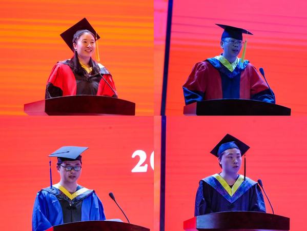 毕业生代表云磊、张登攀在典礼上发言。他们回顾了在校期间的收获与成长,表达了对母校的留恋与不舍,表示将牢记恩师教诲,不畏艰险、追求卓越,祝愿学院桃李天下、再书华章。教师代表娄泰山在发言中与同学们分享了人生经验,希望同学们做有志、有识、有恒的时代新人,祝愿毕业生们前程似锦,事业有成。