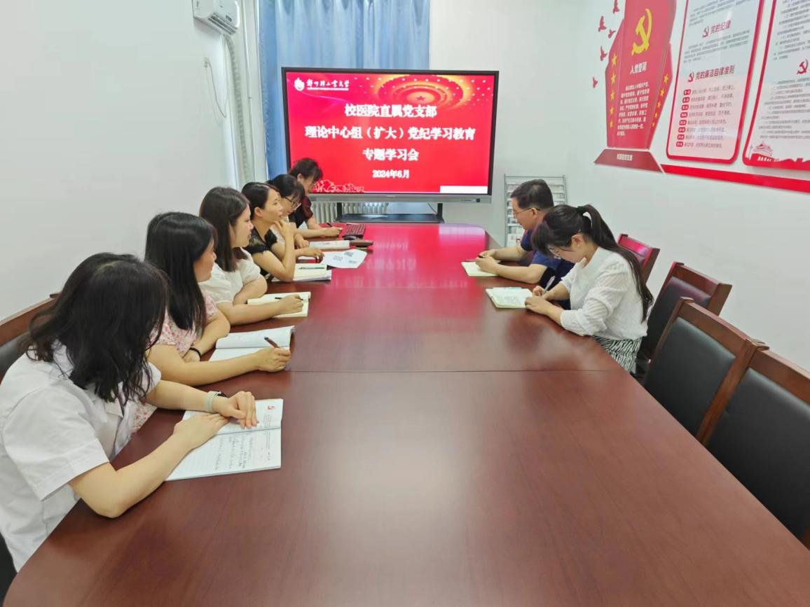 6月17日,校医院直属党支部在科学校区党员活动室召开党纪学习教育理论学习中心组(扩大)学习会。围绕“廉洁纪律、群众纪律”开展专题学习研讨。全体党员参会,会议由直属党支部书记陈勇主持。