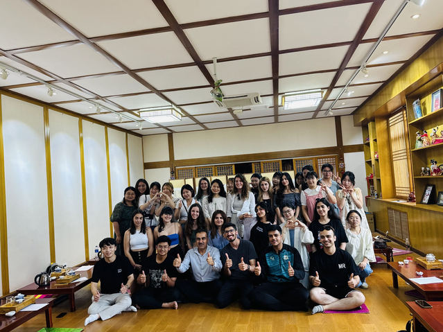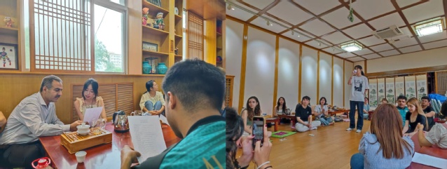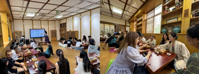 在学院文化体验室,汉语国际教育系海常慧老师给同学们带来了中华优秀传统文化-茶艺的专题体验课,让同学们了解到中国古老的茶文化。她重点讲解了茶席布置与鉴赏、茶礼仪和冲泡手法与技巧等知识,体验沉浸式的课程让同学们立体感知了茶艺之美。品茶的同时,为了让中外青年学生交流更深入,现场还进行了吟诵节目欣赏、教外国学生体验中国歌曲等,集吟唱、民乐表演为一体,呈现了一场视觉与听觉的盛宴。这些活动的受欢迎程度超乎想象,夏令营的学生们被中华文化的力量深深打动,也增进了中外青年的相互了解和沟通。