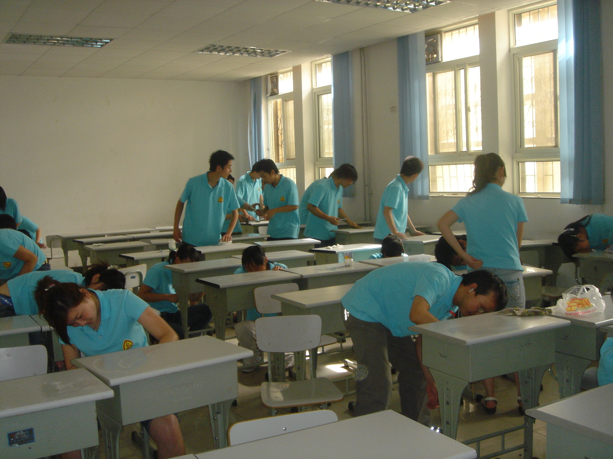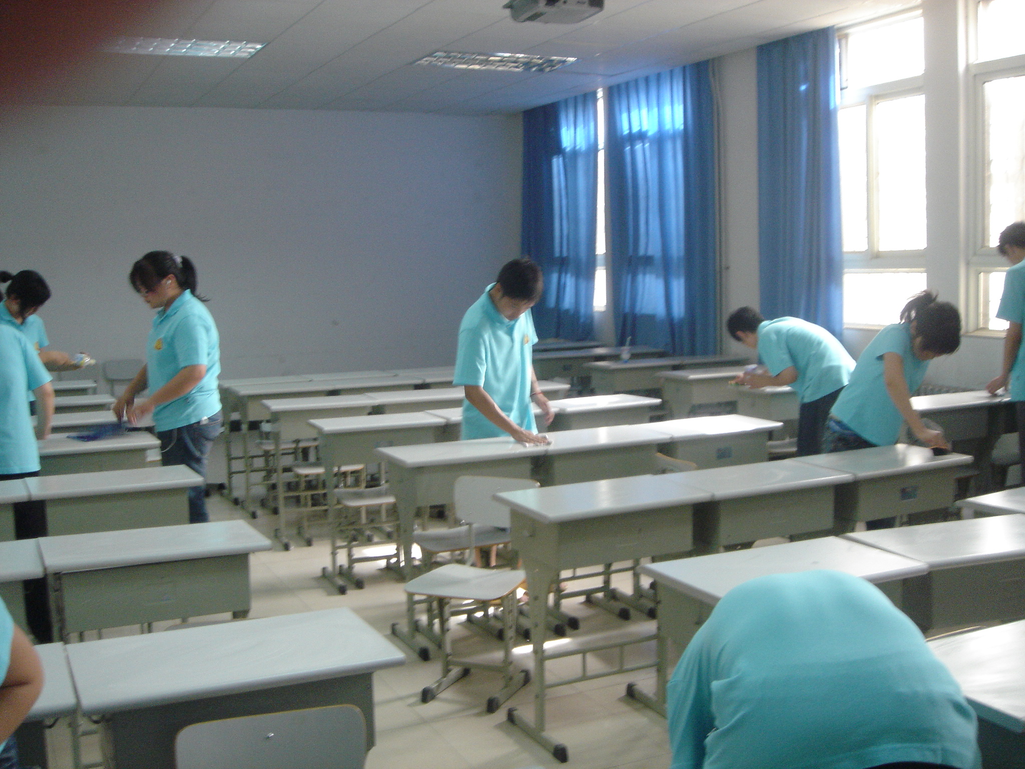 2007年5月24日,在国际教育学院三楼,四楼的教室里,06国际商务一班的全体同学身着统一的蓝色T恤了展开了第二轮轰轰烈烈的义务劳动。