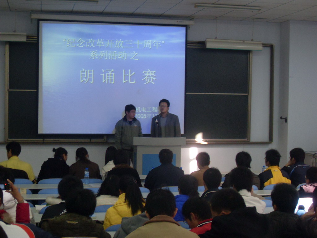 12月4日下午,机电工程学院在教三楼205举办纪念改革开放三十周年系列活动之诗歌朗诵比赛。我院32名选手参加了此次比赛。