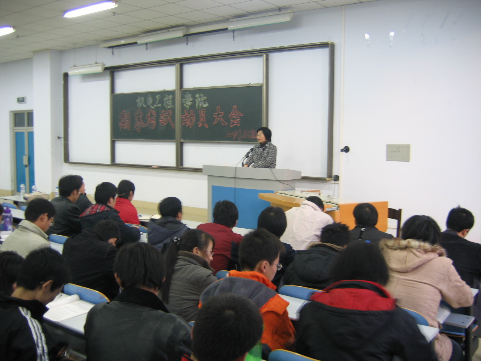 12月13日下午16:30,机电工程学院在教三楼303召开期末考前动员大会,机电工程学院2007级全体新生同学、其他年级学生干部近600名学生参加了动员大会。会议由分团委书记宋德涛老师主持。