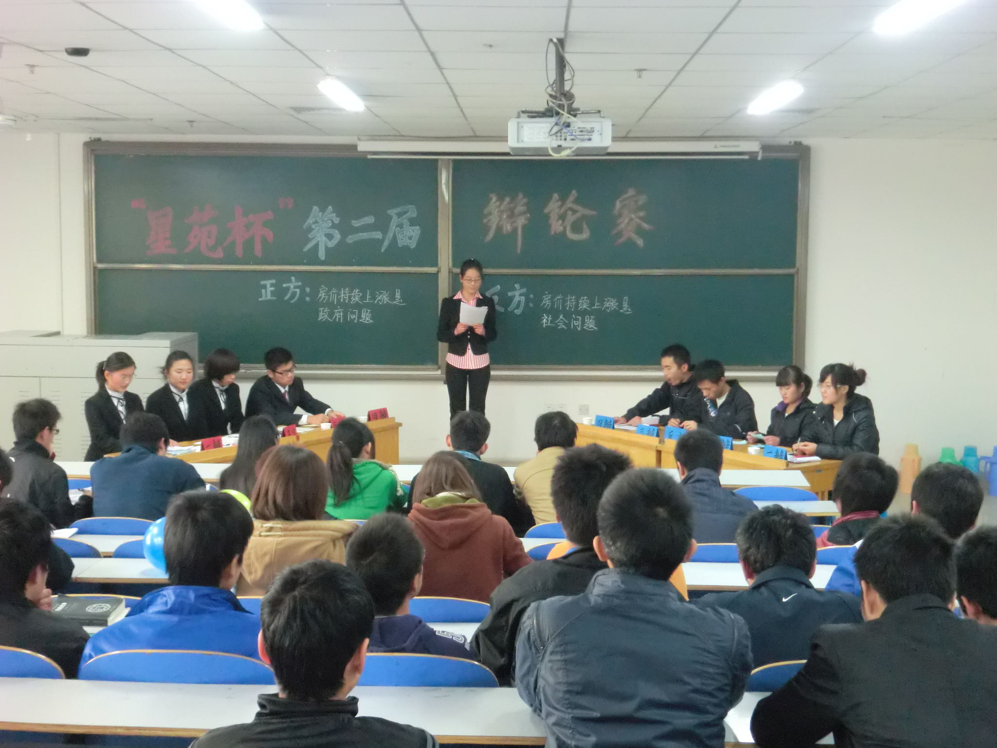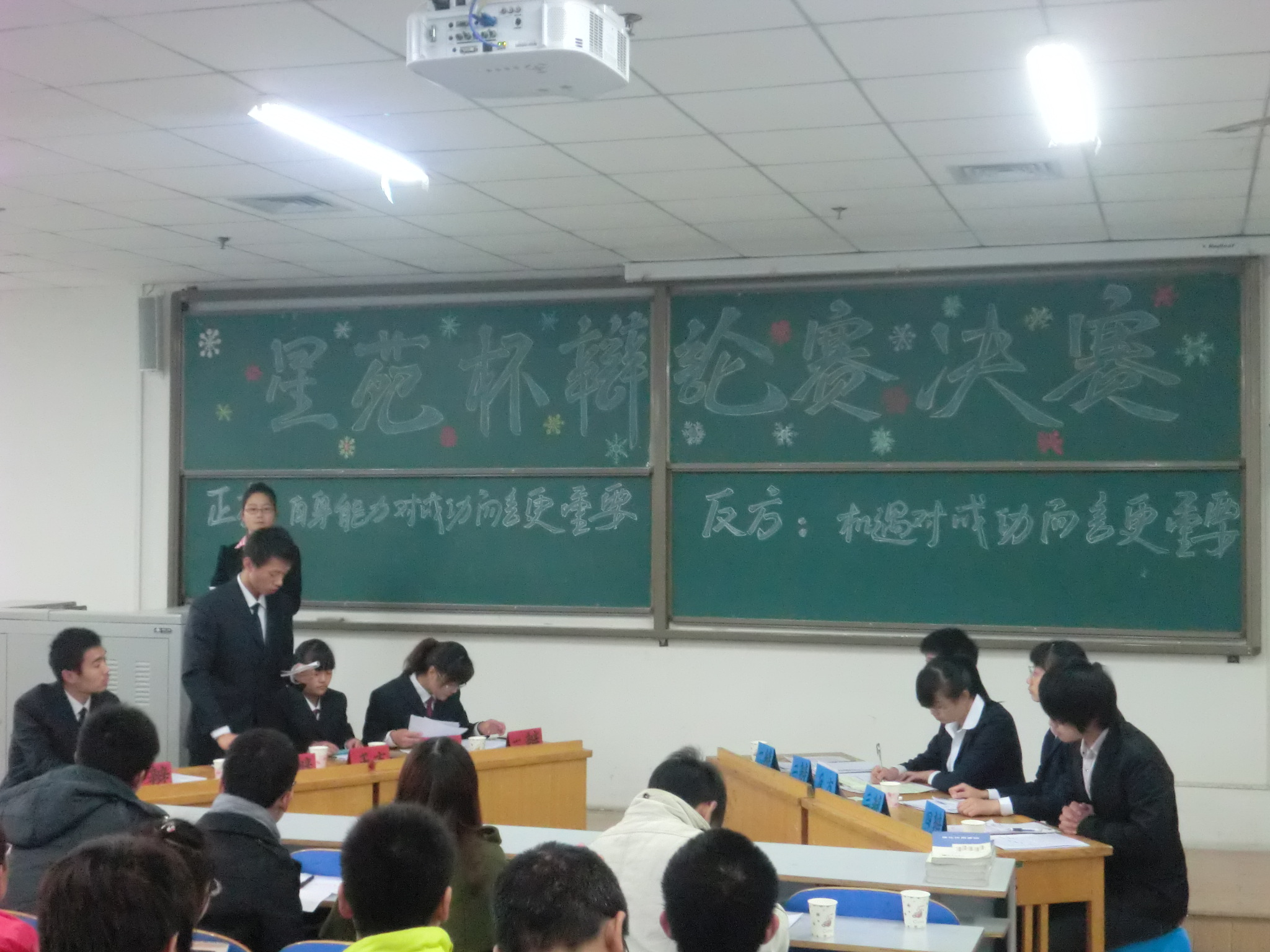 本次辩论赛为期两周,2011级8个班级代表队参加了比赛。共计四百多名同学参与。经过激烈的初赛,复赛,化学班代表队和精细化工班代表队晋级决赛。在辩论赛中,正反双方围绕“爱国需要理性思考还是付诸实践” 、“机遇和个人能力对成功哪个更重要”、“房价持续上涨是政府问题还是社会问题”等社会热点问题,展开了激烈辩论。立论环节,双方一辩对各自所持观点进行了具体陈词;驳论环节,双方三辩提问合适,回答中肯,反驳有力;自由辩论环节,辩手们反应机敏,语言流畅,说理透彻,为我们呈现了一场场精彩丰富的辩论赛。经过激烈的角逐,最终化学班代表队获得了冠军,王卫华获得最佳辩手荣誉称号。