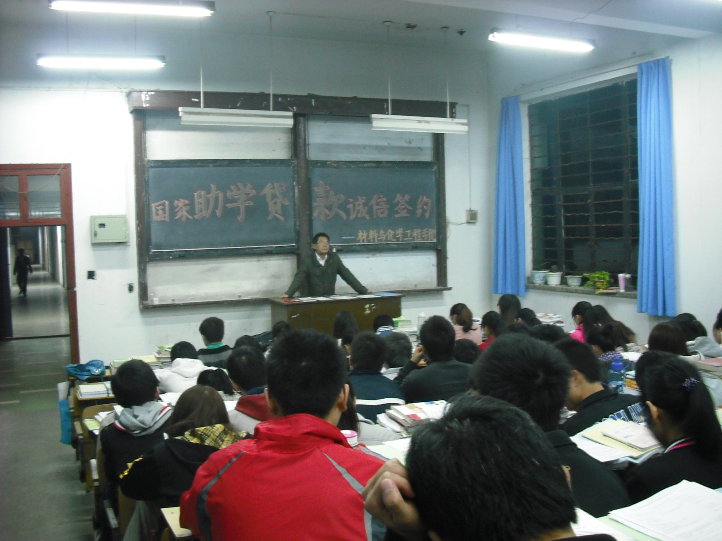 为了进一步做好2011学年度国家助学贷款工作,10月29日晚上和10月31日中午,材料与化学工程学院分别在东风校区化阶教室和科学校区电教楼204教室召开国家助学贷款诚信教育大会及合同签订仪式,党总支周立明副书记、负责学生助学贷款的老师和本学年的贷款学生参加了大会。