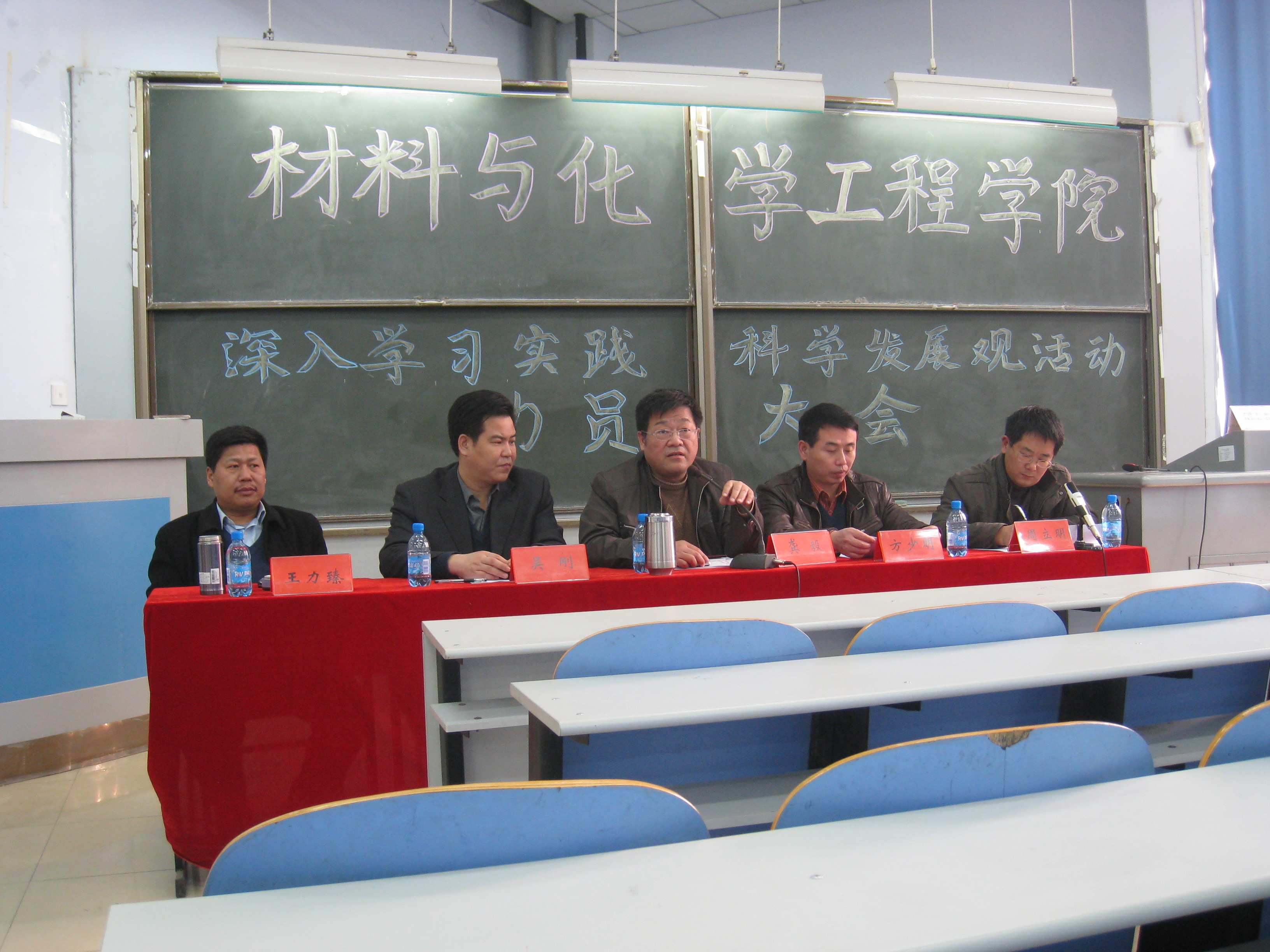 材料与化学工程学院党总支周立明副书记主持动员大会。党总支吴刚书记代表总支作了动员讲话,他对我院深入学习实践科学发展观活动进行了部署, 他强调,开展深入学习实践科学发展观活动,是深入贯彻落实党的十七大精神、推进中国特色社会主义事业的重大举措;是坚持社会主义办学方向、办人民满意高等教育的客观需要;以科学发展观为指导,从工作实际出发,破解工作难题、提高工作水平的现实要求,对促进我校提高人才培养质量和办学水平具有重要的现实意义。各党支部要严格按照总支统一部署,准确把握学习实践科学发展观活动的指导思想、基本原则、目标要求、重点要解决的问题和具体安排,确保学习实践科学发展观活动取得实效。他要求,广大党员在学习实践科学发展观活动中,要把学习实践活动与2009年点工作结合起来,重点突出解决。搞好学习实践活动,要重点抓好“学习调研、分析检查、整改落实”三个阶段六个环节的工作。要紧密结合部门工作实际,找准工作切入点,牢牢抓住关键环节,下功夫理清发展思路,下功夫解决突出问题,下功夫健全规章制度。要正确处理学习实践活动与正常工作的关系,统筹兼顾、合理安排,把学习实践活动作为搞好各项工作的动力,以各项工作取得的成果来检验学习实践活动的实际成效,努力实现两手抓、两不误、两促进。