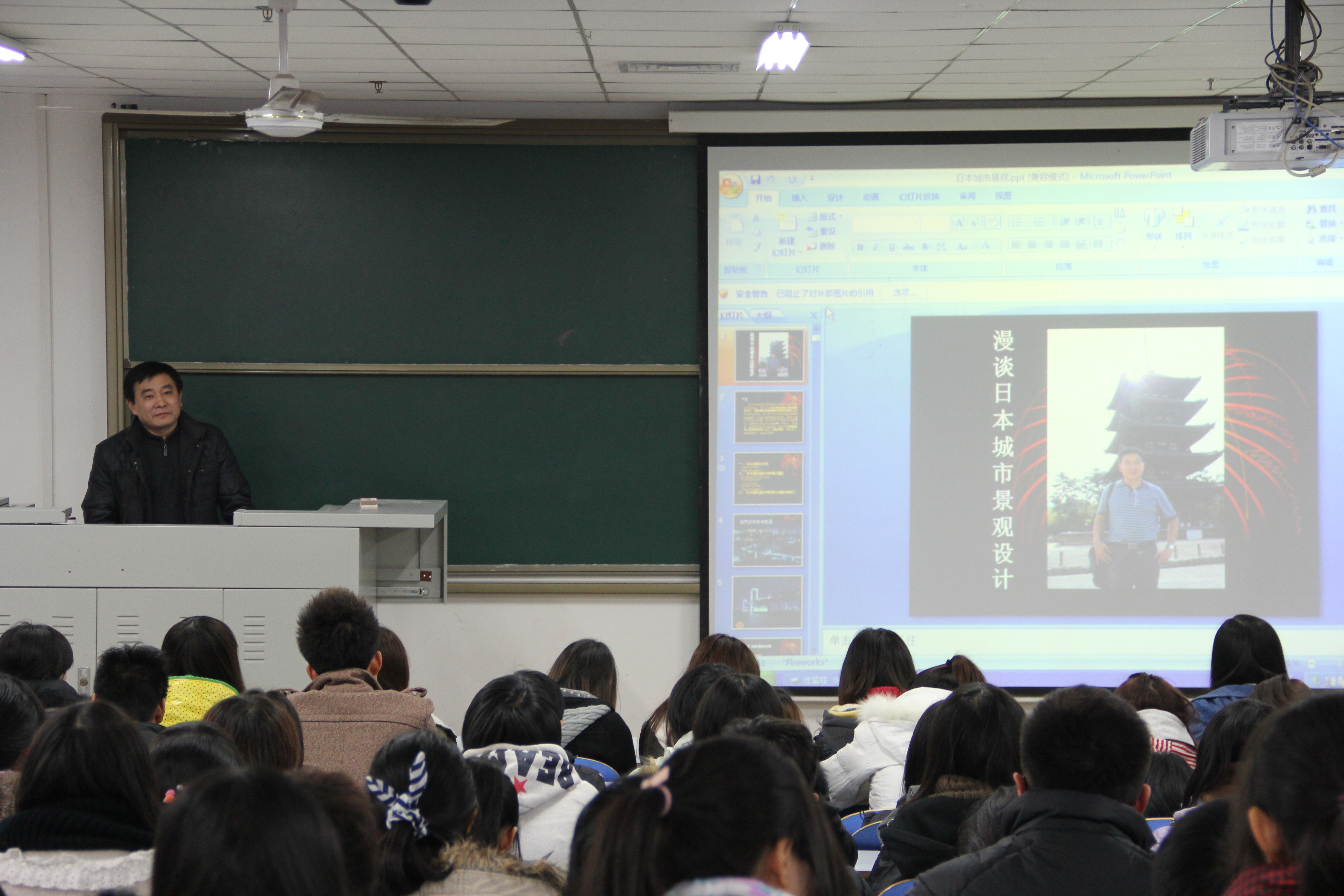 任留柱教授首先从日本的地理位置和国家概况讲起,分别从日本的文化形成与发展、日本景观设计的发展与特点、日本景观设计的启示等三方面介绍了日本城市景观设计的发展概况。报告以大量详实的资料照片及独家视频等第一手材料,穿插了任留柱教授在日本作为访问学者期间的奇闻趣事和所见所闻,加上幽默生动的语言,深深吸引了在座的每一位师生,并以其宽广的知识面和独到的见解,使同学们对日本城市景观设计以及日本文化都有了一个直观的印象和深刻的了解。