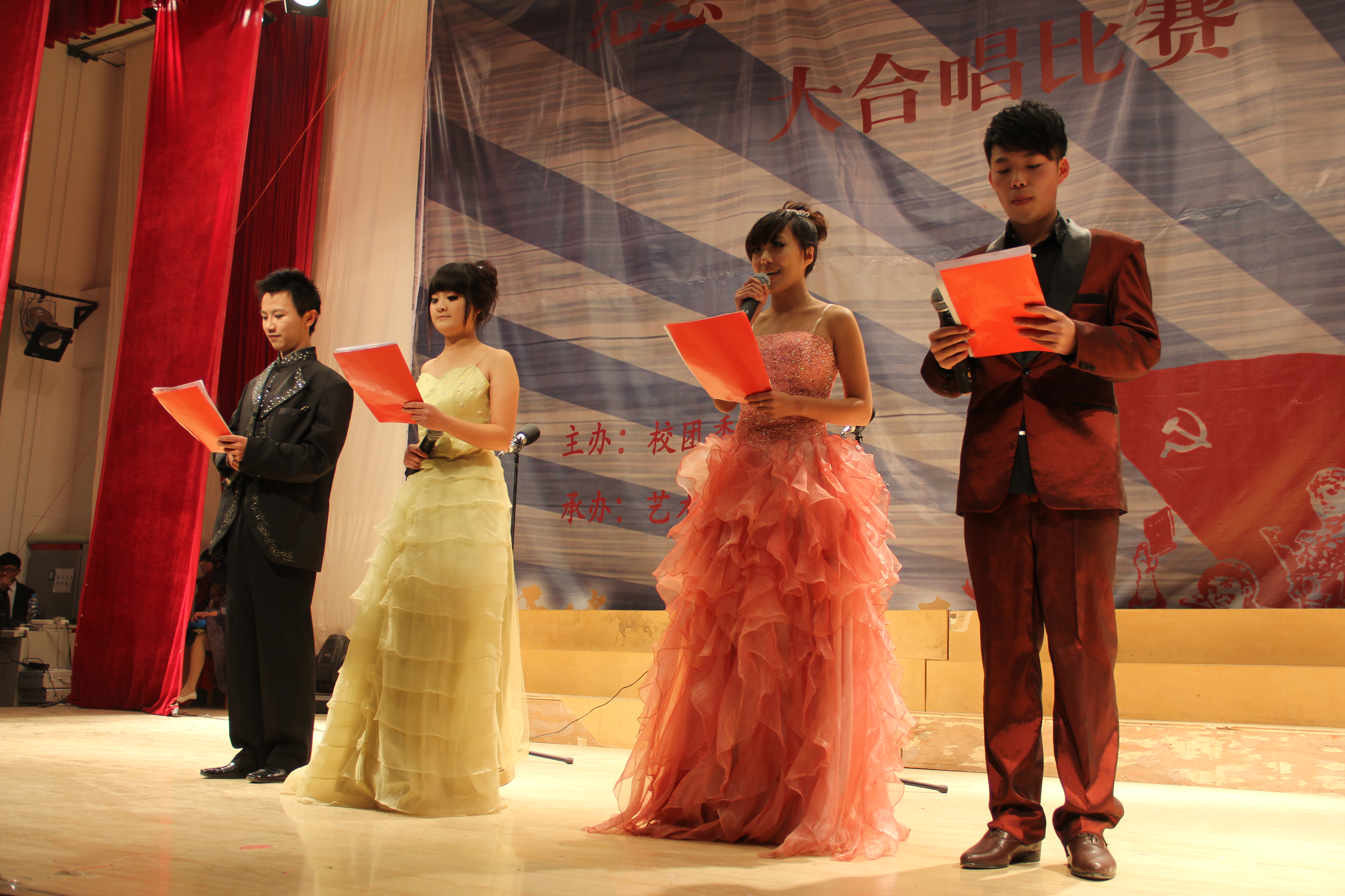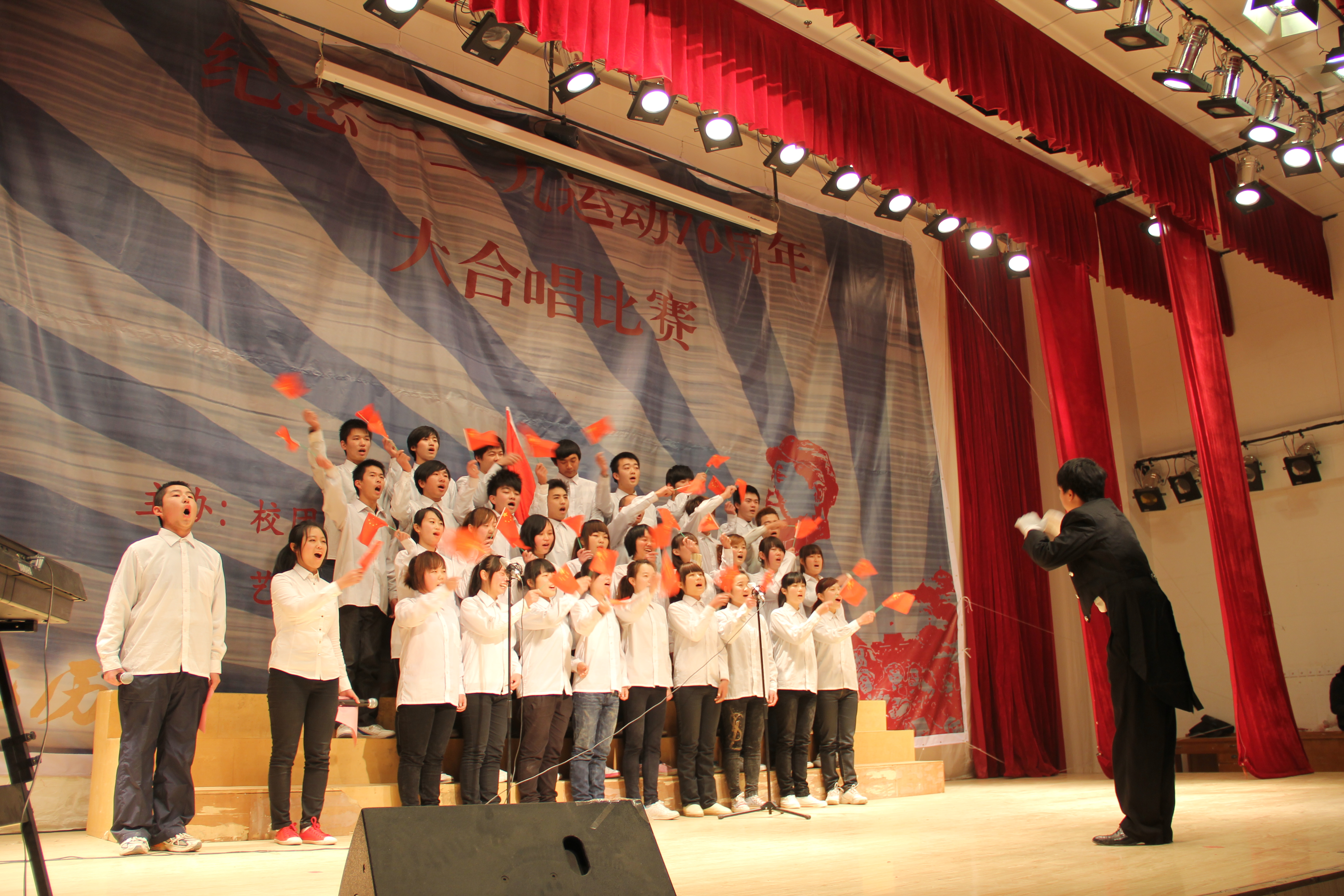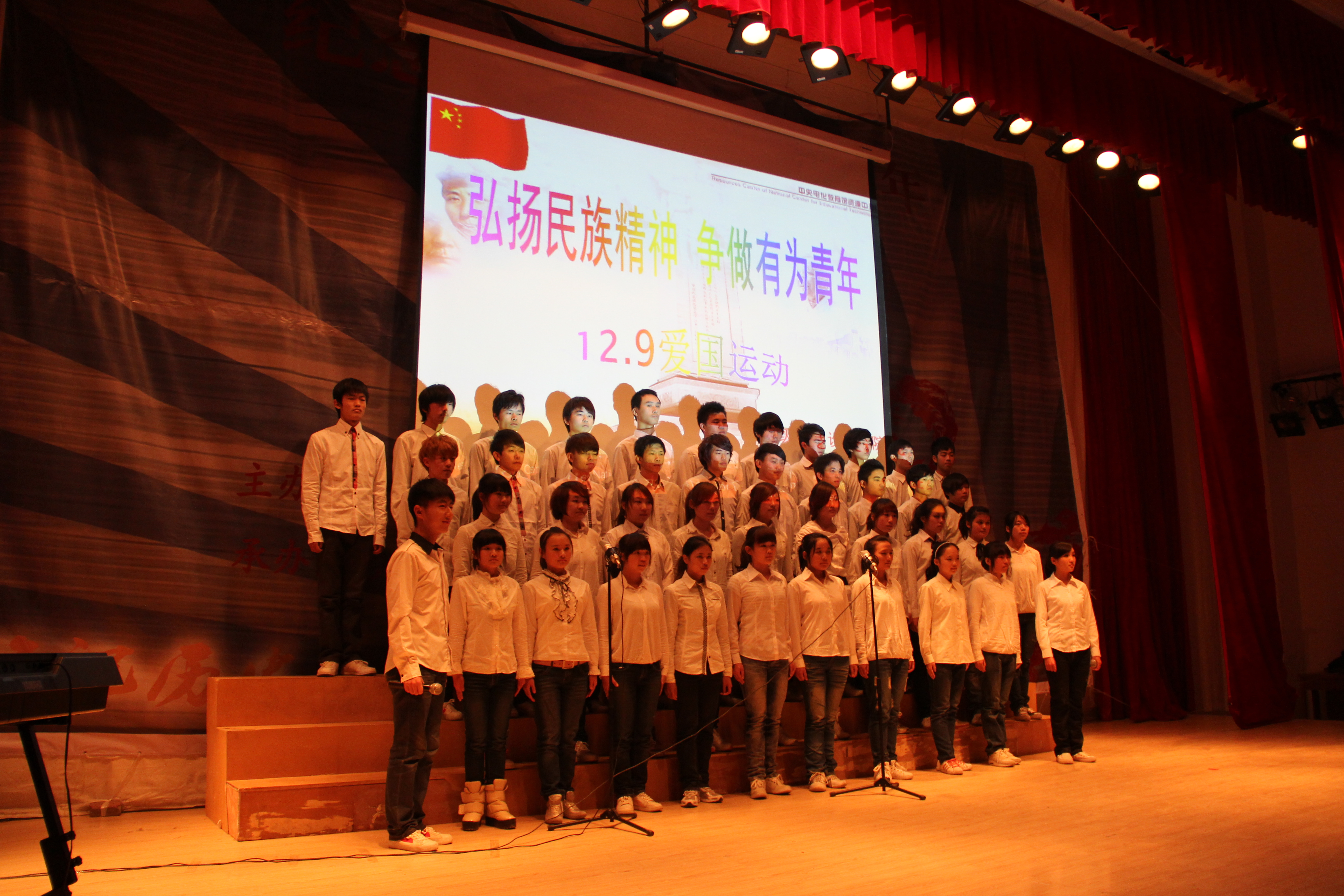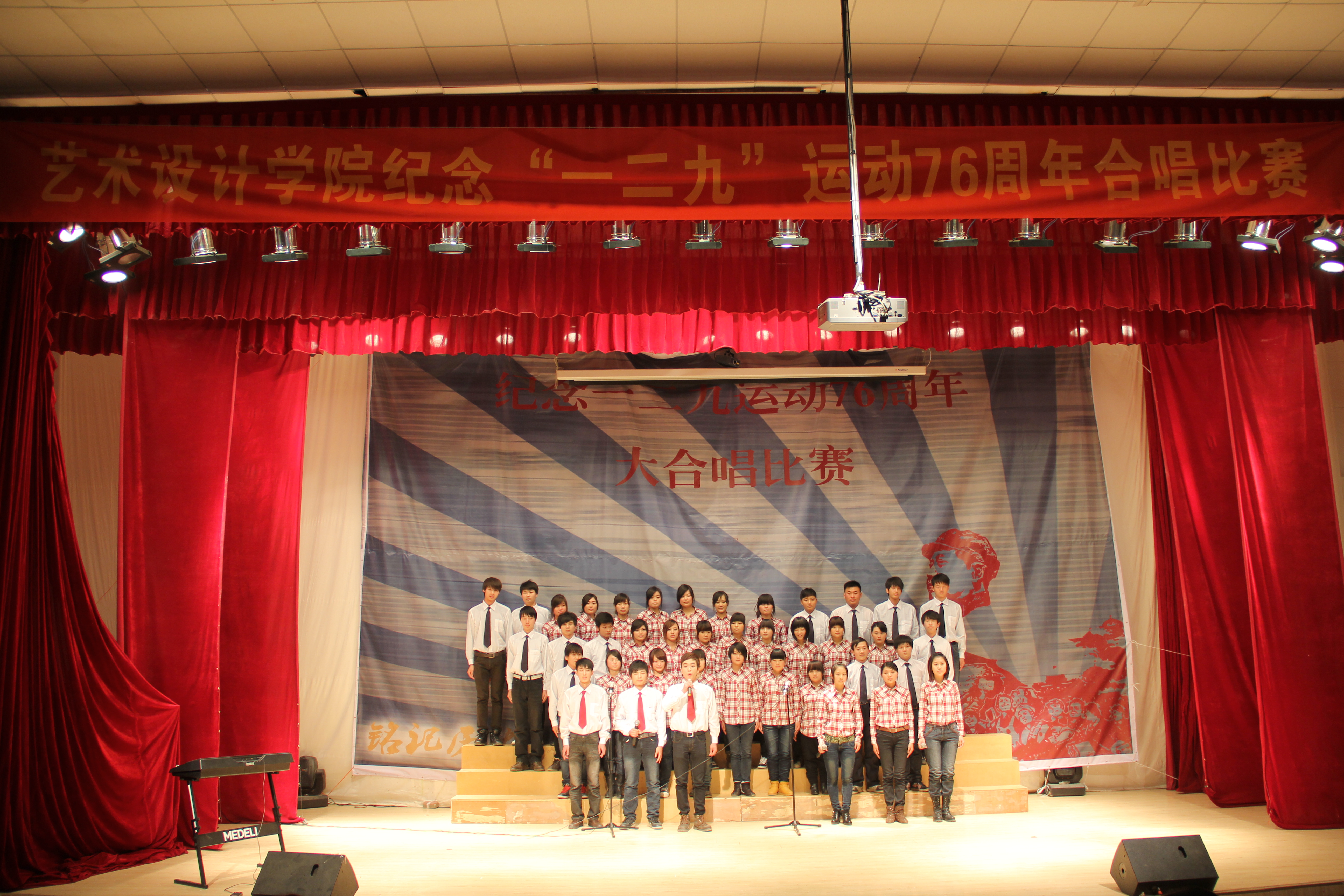 为纪念一二九运动76周年,进一步加强大学生的爱国、集体主义和民族精神教育,提高全院大学生的思想政治素质,丰富同学们的课余生活,积极营造健康的校园文化。由校团委主办、艺术设计学院承办的 纪念一二・九运动76周年大合唱比赛于2011年12月1日下午在科学校区电教楼208举行。校团委副书记张超钦、艺术设计学院党总支副书记邵元珠、食工学院分团委书记袁杰、艺术设计学院动画系博士汤梦萧、艺术设计学院学工办主任张莉、分团委副书记任红印、辅导员霍庆媛、贾红雨、王花蕊、李景元等老师观看了比赛。