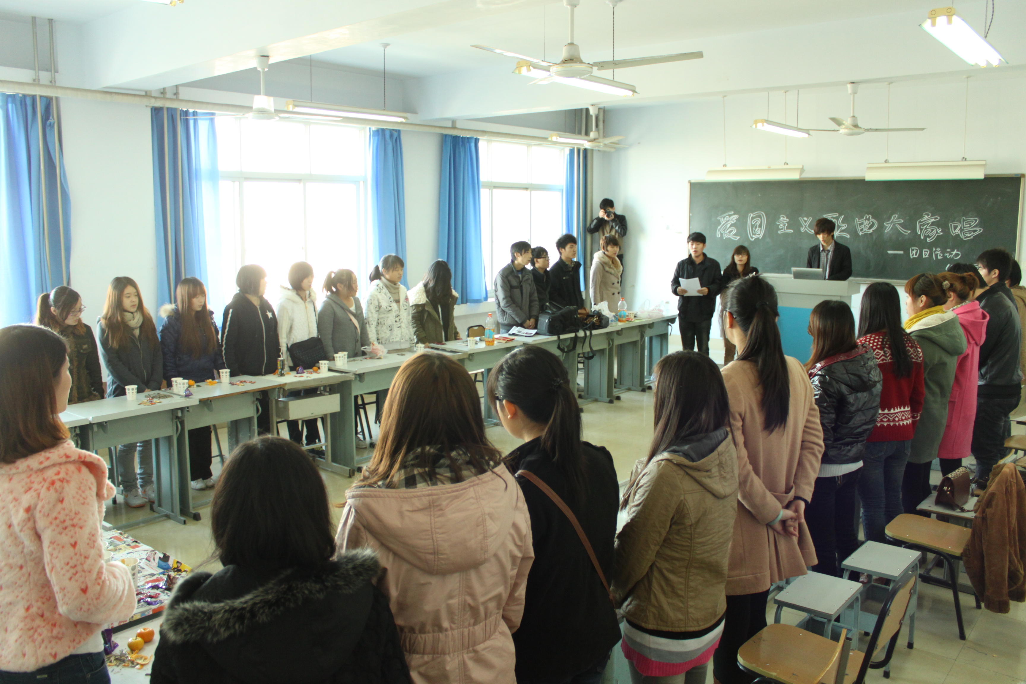 为纪念“一二・九”运动76周年,深入开展以爱国主义为核心的民族精神教育,根据校团委工作安排,艺术设计学院在2011年11月16日-26日期间举办“爱国歌曲大家唱”主题团日活动,10级各团支部根据要求在专业教室开展活动,唱响共产党好、社会主义好、改革开放好、伟大祖国好的时代主旋律。